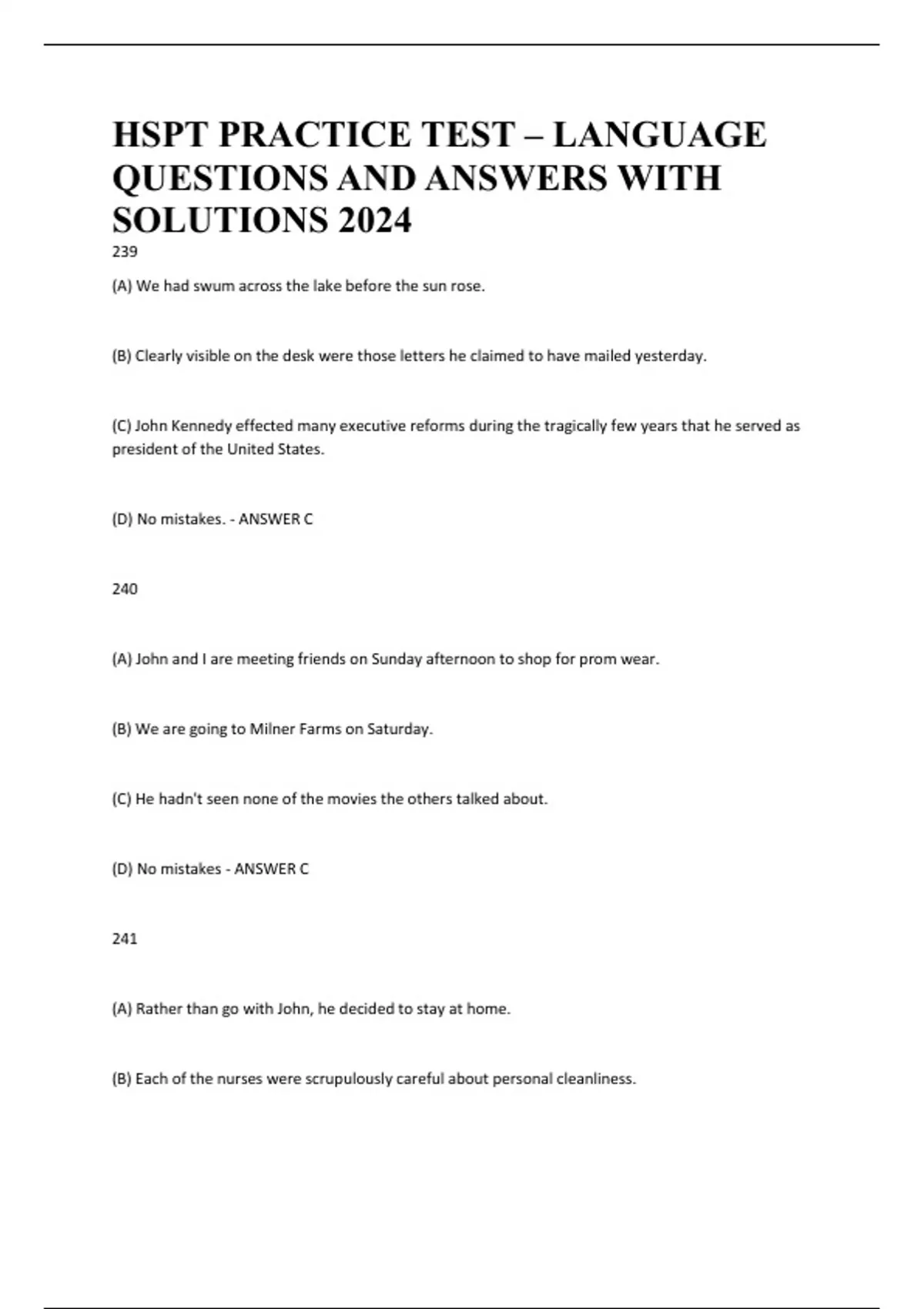 HSPT PRACTICE TEST – LANGUAGE QUESTIONS AND ANSWERS WITH SOLUTIONS 2024