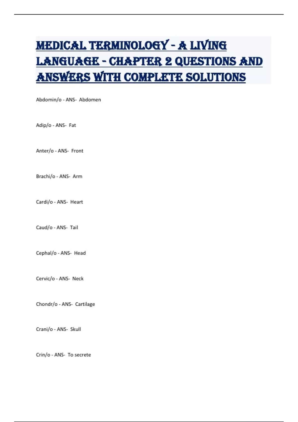 Medical Terminology - A Living Language - Chapter 2 Questions and Answers with complete solutions Abdomin/o - ANS- Abdomen Adip/o - ANS- Fat Anter/o - ANS- Front Brachi/o - ANS- Arm Cardi/o - ANS- Heart Caud/o - ANS- Tail Cephal/o - ANS- Head Cervic/o - ANS- Neck Chondr/o - ANS- Cartilage Crani/o - ANS- Skull Crin/o - ANS- To secrete Crur/o - ANS- Leg Cyt/o - ANS- Cell Demat/o - ANS- Skin Dist/o - ANS- Away from Dors/o - ANS- Back of body Enter/o - ANS- Small intestine Epitheli/o - ANS- Epithelium Gastr/o - ANS- Stomach glute/o - ANS- Buttock Gynec/o - ANS- Woman Hemat/o - ANS- Blood Hist/o - ANS- Tissue Immun/o - ANS- Protection Infer/o - ANS- Below Laryng/o - ANS- Larynx Later/o - ANS- Side Lumb/o - ANS- Loin Lymph/o - ANS- Lymph Medi/o - ANS- Middle Muscul/o - ANS- Muscles Nephr/o - ANS- Kidney Neur/o - ANS- Nerve Ophthalm/o - ANS- Eye Ot/o - ANS- Ear Pelv/o - ANS- Pelvis