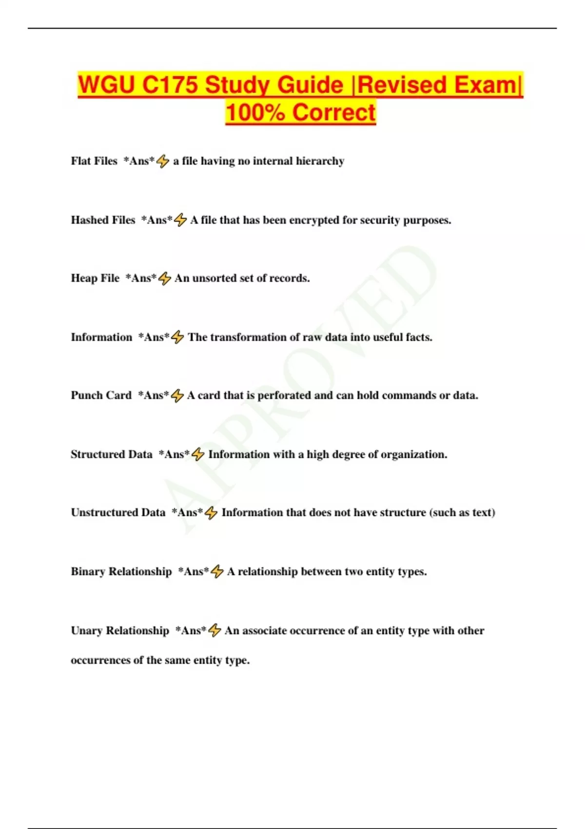 WGU C175 Study Guide |Revised Exam| 100% Correct Flat Files *Ans* a file having no internal hierarchy Hashed Files *Ans* A file that has been encrypted for security purposes. Heap File *Ans* An unsorted set of records. Information *Ans* The transformation of raw data into useful facts. Punch Card *Ans* A card that is perforated and can hold commands or data. Structured Data *Ans* Information with a high degree of organization. Unstructured Data *Ans* Information that does not have structure (such as text) Binary Relationship *Ans* A relationship between two entity types. Unary Relationship *Ans* An associate occurrence of an entity type with other occurrences of the same entity type. Cardinality *Ans* The maximum number of entities that can be involved in a particular relationship. E-R Model *E-R = Entity - Relationship *Ans* Diagram of entities together with their attributes and the relationship among them. Intersection Data *Ans* It is data that describes a many-to-many relationship. Modality *Ans* It is a minimum number of entity occurrences that can be involved in a relationship. One-to-one Binary Relationship *Ans* It means that a single occurrence of one entity type can be associated with a single occurrence of the other entity type and vice versa. Ternary Relationship *Ans* Involves three different entity types. Unique identifier *Ans* It is used to uniquely identify each record in a database table. Attribute *Ans* A property, characteristic, or fact that we know about an entity. "A salesperson works in one office." What is the name of this relationship? *Ans* One-to-one binary relationship "A salesperson sells to many customers." What is the name of this relationship? *Ans* One-to-many binary relationship "A salesperson is authorized to sell many products, and a product can be sold by many salespersons." What is the name of this relationship? *Ans* Many-to-many binary relationship What is the positioning and meaning for Cardinality and Modality on an E-R model? *Ans* Cardinality is the outer symbol; represents the maximum. Modality is the inner symbol; represents the minimum. "A salesperson works in