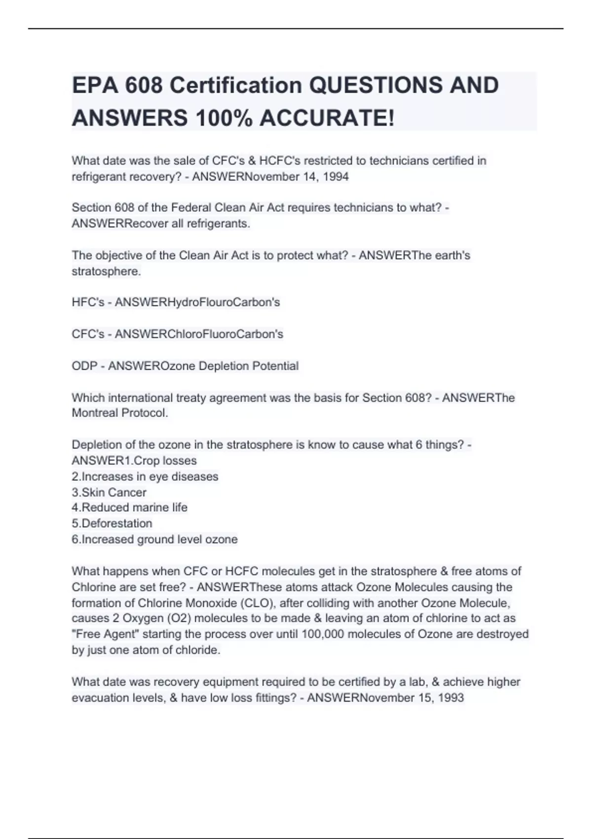 EPA 608 Certification QUESTIONS AND ANSWERS 100% ACCURATE!
