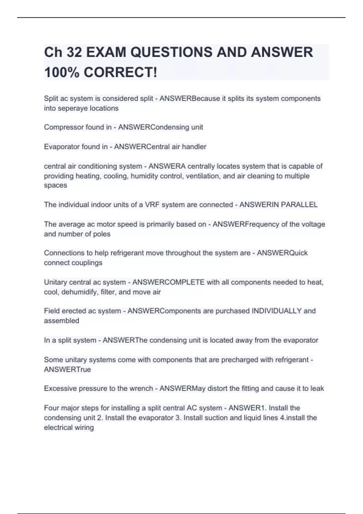 Split ac system is considered split - ANSWERBecause it splits its system components into seperaye locations Compressor found in - ANSWERCondensing unit Evaporator found in - ANSWERCentral air handler central air conditioning system - ANSWERA centrally locates system that is capable of providing heating, cooling, humidity control, ventilation, and air cleaning to multiple spaces The individual indoor units of a VRF system are connected - ANSWERIN PARALLEL The average ac motor speed is primarily based on - ANSWERFrequency of the voltage and number of poles Connections to help refrigerant move throughout the system are - ANSWERQuick connect couplings