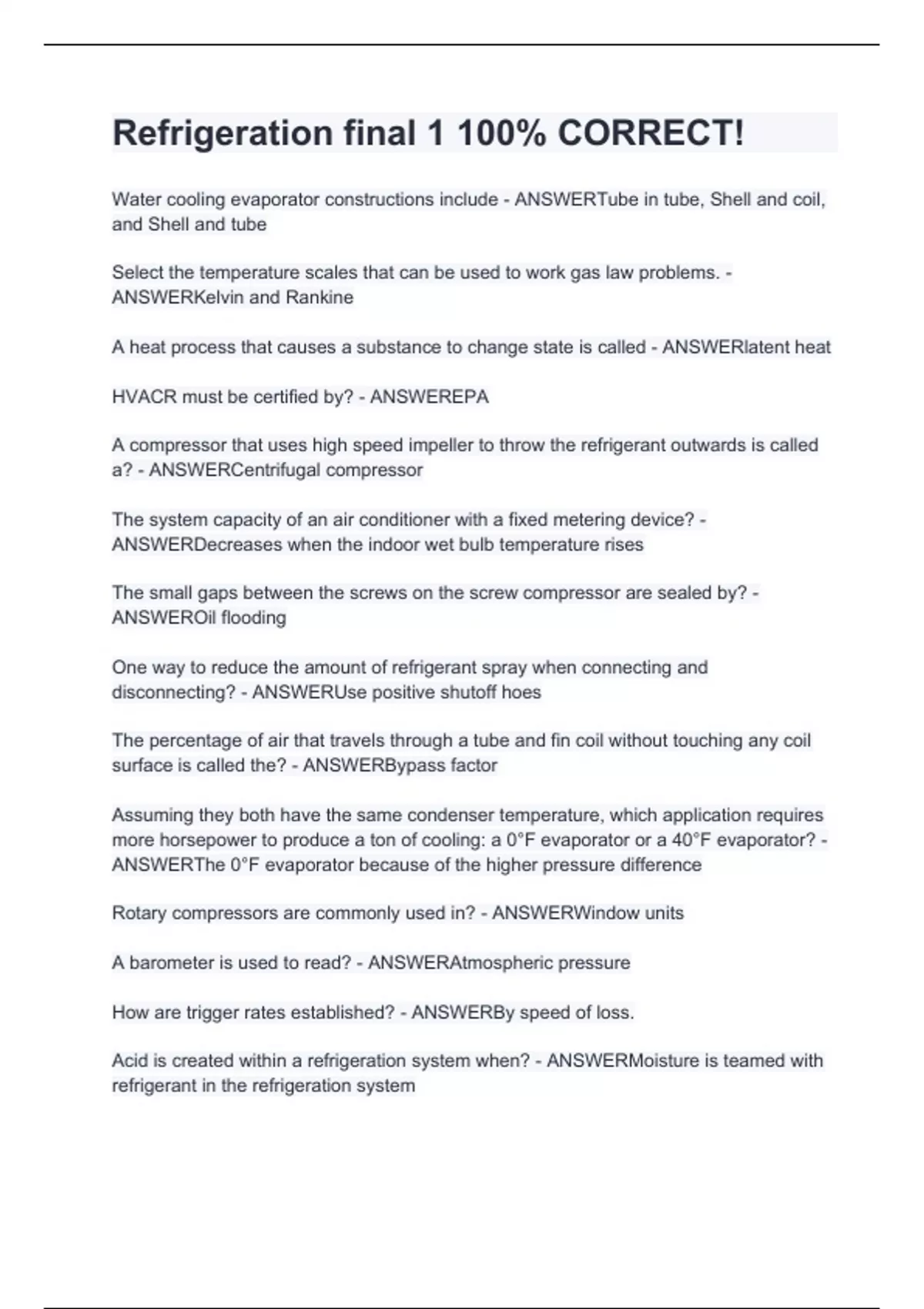Water cooling evaporator constructions include - ANSWERTube in tube, Shell and coil, and Shell and tube Select the temperature scales that can be used to work gas law problems. - ANSWERKelvin and Rankine A heat process that causes a substance to change state is called - ANSWERlatent heat HVACR must be certified by? - ANSWEREPA A compressor that uses high speed impeller to throw the refrigerant outwards is called a? - ANSWERCentrifugal compressor The system capacity of an air conditioner with a fixed metering device? - ANSWERDecreases when the indoor wet bulb temperature rises