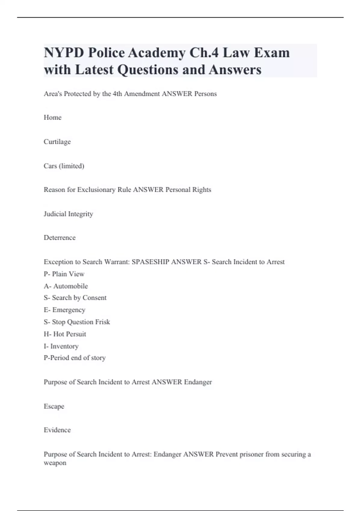 NYPD Police Academy Ch.4 Law Exam with Latest Questions and Answers Area's Protected by the 4th Amendment ANSWER Persons Home Curtilage Cars (limited) Reason for Exclusionary Rule ANSWER Personal Rights Judicial Integrity Deterrence Exception to Search Warrant: SPASESHIP ANSWER S- Search Incident to Arrest P- Plain View A- Automobile S- Search by Consent E- Emergency S- Stop Question Frisk H- Hot Persuit I- Inventory P-Period end of story Purpose of Search Incident to Arrest ANSWER Endanger Escape Evidence Purpose of Search Incident to Arrest: Endanger ANSWER Prevent prisoner from securing a weapon