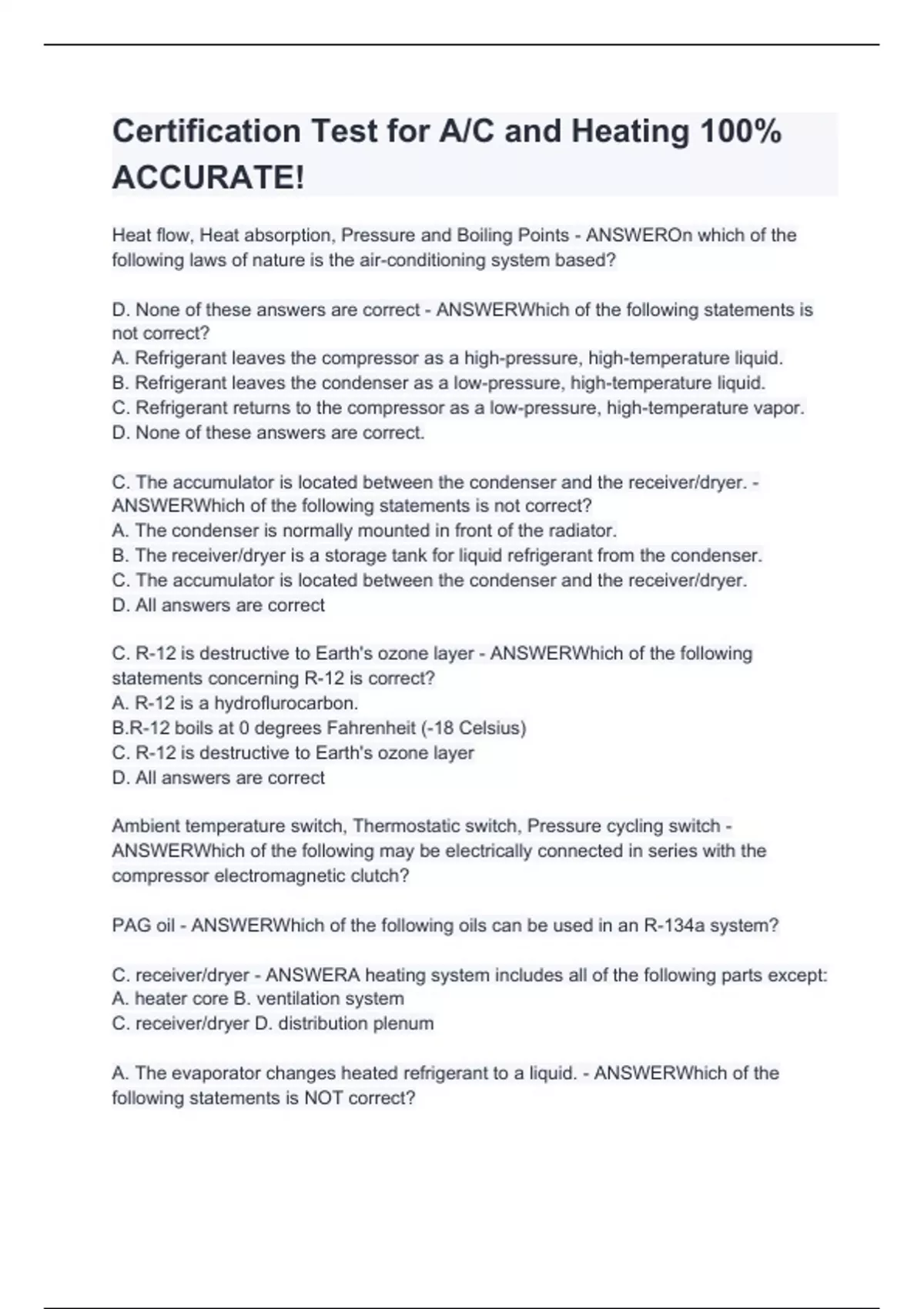 Heat flow, Heat absorption, Pressure and Boiling Points - ANSWEROn which of the following laws of nature is the air-conditioning system based? D. None of these answers are correct - ANSWERWhich of the following statements is not correct? A. Refrigerant leaves the compressor as a high-pressure, high-temperature liquid. B. Refrigerant leaves the condenser as a low-pressure, high-temperature liquid. C. Refrigerant returns to the compressor as a low-pressure, high-temperature vapor. D. None of these answers are correct. C. The accumulator is located between the condenser and the receiver/dryer. - ANSWERWhich of the following statements is not correct? A. The condenser is normally mounted in front