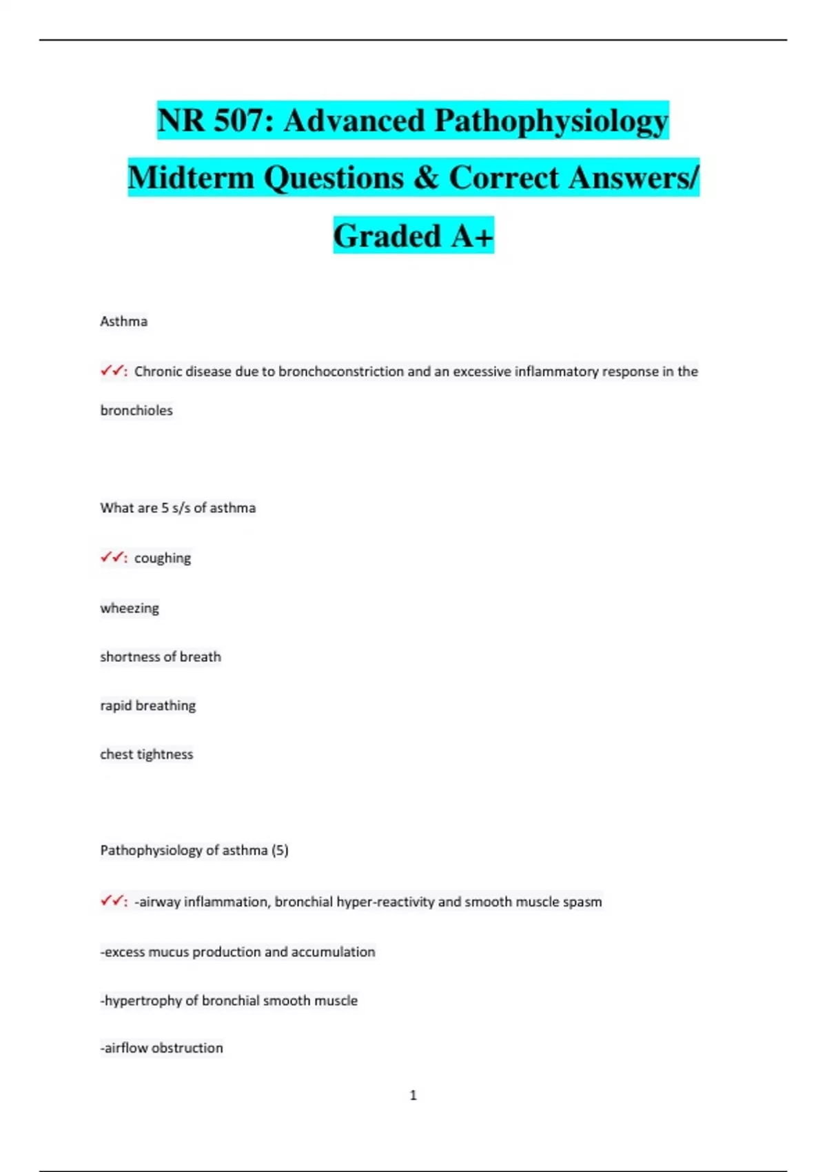 NR 507: Advanced Pathophysiology Midterm Questions & Correct Answers/ Graded A+