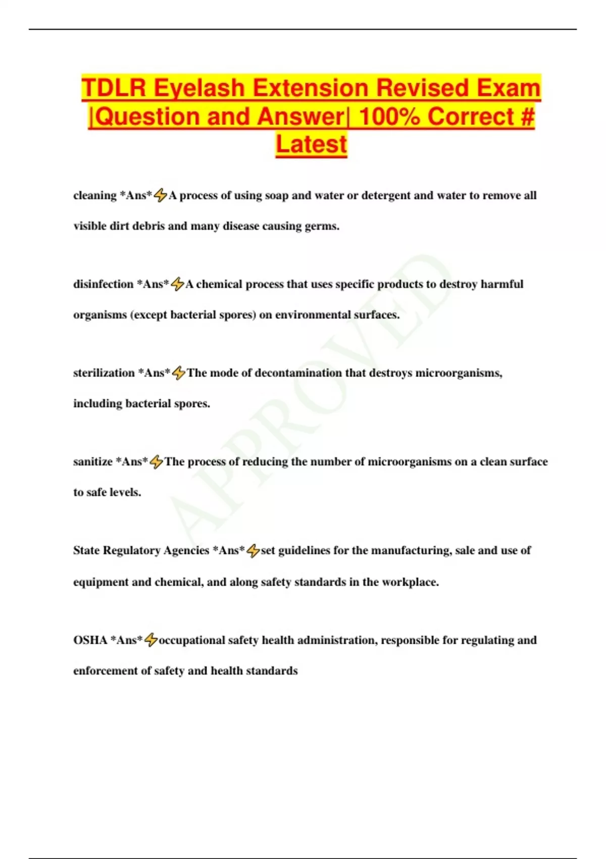 TDLR Eyelash Extension Revised Exam |Question and Answer| 100% Correct # Latest cleaning *Ans* A process of using soap and water or detergent and water to remove all visible dirt debris and many disease causing germs. disinfection *Ans* A chemical process that uses specific products to destroy harmful organisms (except bacterial spores) on environmental surfaces. sterilization *Ans* The mode of decontamination that destroys microorganisms, including bacterial spores. sanitize *Ans* The process of reducing the number of microorganisms on a clean surface to safe levels. State Regulatory Agencies *Ans* set guidelines for the manufacturing, sale and use of equipment and chemical, and along safety standards in the workplace. OSHA *Ans* occupational safety health administration, responsible for regulating and enforcement of safety and health standards MSDS *Ans* A widely used abbreviation, contains details of the hazards associated with a chemical, and gives information on its hazardous ingredients, safe handling and use procedures EPA *Ans* This agency registers all types of disinfectants sold and used in the United States. Laws *Ans* Statutes written by both federal and state legislatures that determine the scope of practice. infection *Ans* the invasion of the body tissue by disease causing pathogen. disinfectants *Ans* Chemical products capable of destroying bacteria, virus and fungi on surfaces which should be mix according to mfg instructions on the label so they are safe and effective. decontamination method #1 *Ans* Cleaning then disinfecting with an appropriate EPAregistered disinfectant by completely immersing implements for 5-10mins. decontamination method #2 *Ans* Cleaning and then sterilizing. consultation intake form *Ans* client acknowledgement of the services being performed.