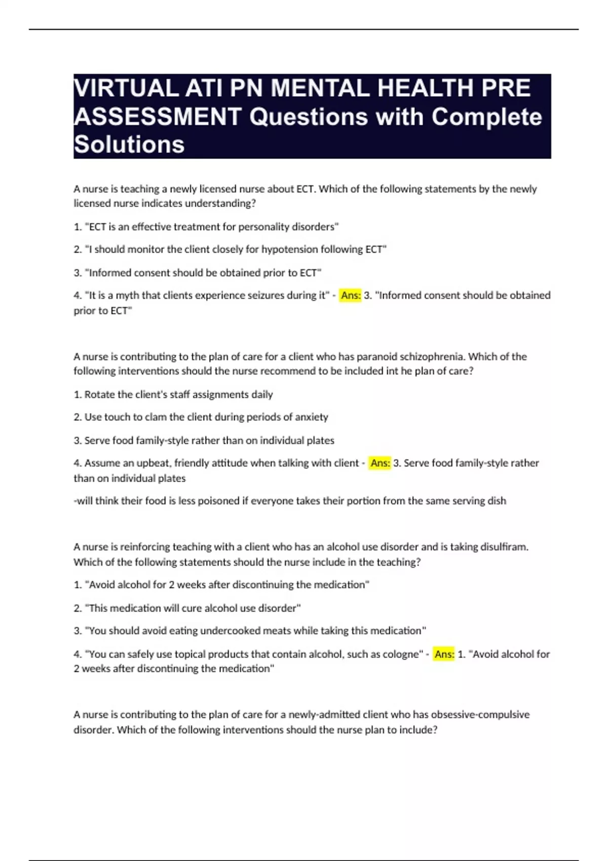 VIRTUAL ATI PN MENTAL HEALTH PRE ASSESSMENT Questions with Complete Solutions