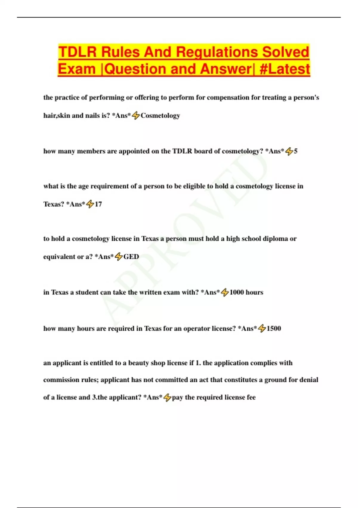 TDLR Rules And Regulations Solved Exam |Question and Answer| #Latest the practice of performing or offering to perform for compensation for treating a person's hair,skin and nails is? *Ans* Cosmetology how many members are appointed on the TDLR board of cosmetology? *Ans* 5 what is the age requirement of a person to be eligible to hold a cosmetology license in Texas? *Ans* 17 to hold a cosmetology license in Texas a person must hold a high school diploma or equivalent or a? *Ans* GED in Texas a student can take the written exam with? *Ans* 1000 hours how many hours are required in Texas for an operator license? *Ans* 1500 an applicant is entitled to a beauty shop license if 1. the application complies with commission rules; applicant has not committed an act that constitutes a ground for denial of a license and applicant? *Ans* pay the required license fee when does a license expire? *Ans* second anniversary of the date of the license what type of program is mandatory for all l