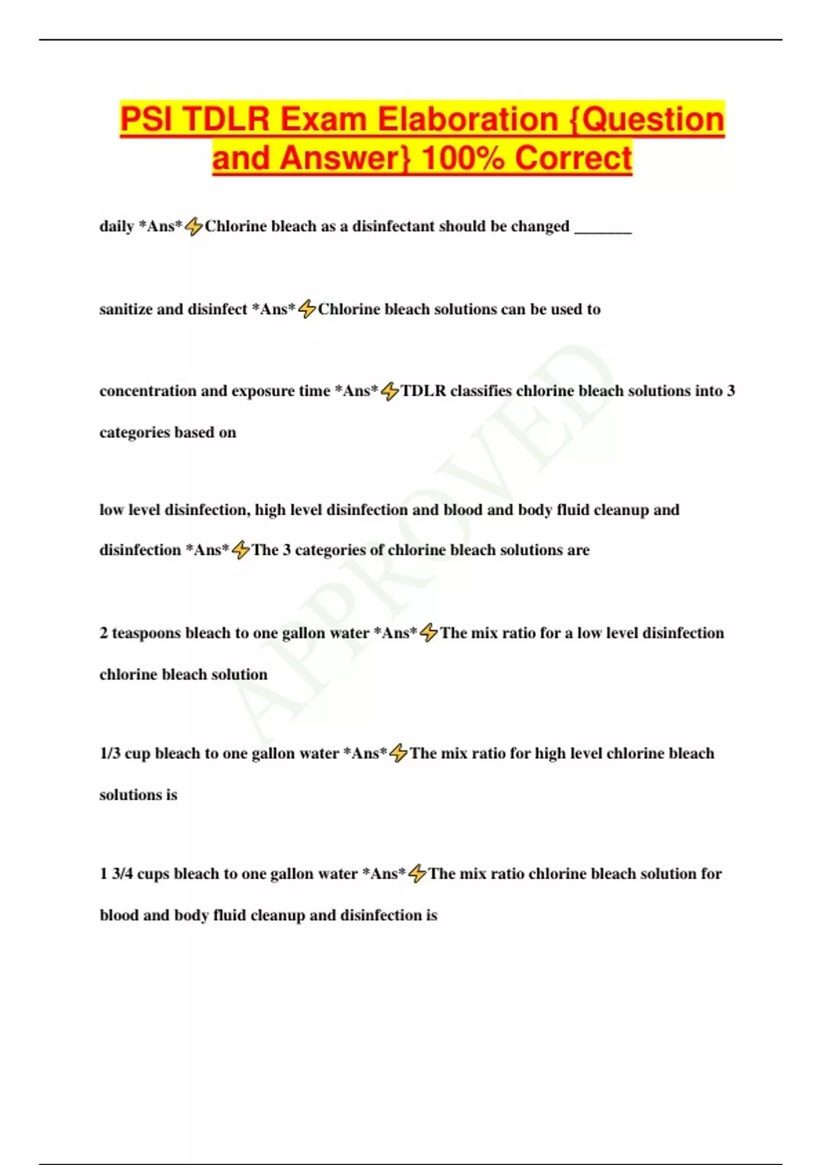 PSI TDLR Exam Elaboration {Question and Answer} 100% Correct daily *Ans* Chlorine bleach as a disinfectant should be changed _______ sanitize and disinfect *Ans* Chlorine bleach solutions can be used to concentration and exposure time *Ans* TDLR classifies chlorine bleach solutions into 3 categories based on low level disinfection, high level disinfection and blood and body fluid cleanup and disinfection *Ans* The 3 categories of chlorine bleach solutions are 2 teaspoons bleach to one gallon water *Ans* The mix ratio for a low level disinfection chlorine bleach solution 1/3 cup bleach to one gallon water *Ans* The mix ratio for high level chlorine bleach solutions is 1 3/4 cups bleach to one gallon water *Ans* The mix ratio chlorine bleach solution for blood and body fluid cleanup and disinfection is disinfectant *Ans* An EPA-registered bactericidal, fungicidal and virucidal chemical is a disinfecting *Ans* Using chemicals to destroy pathogens on implements and on hard, non porous surfaces EPA registered disinfectant and bleach *Ans* What 2 chemicals does TDLR recommend for destroying most pathogens on a surface? sterilizing *Ans* Destroying all forms of bacteria and other microorganisms including bacterial spores 10 minutes *Ans* A low level chlorine bleach solution has an immersion time of 20 minutes *Ans* A high level disinfection chlorine bleach solution has an immersion time of 10% bleach solution *Ans* A blood and body fluid cleanup and disinfection chlorine bleach solution is also called cleaned *Ans* Prior to disinfection, the surface must be they become visibly contaminated *Ans* Disinfectants become inactivated when use a spray on disinfectant *Ans* To disinfect electrical equipment you TDLR *Ans* Rules to follow when using and mixing disinfectants are written by daily *Ans* Chlorine bleach solution used for s