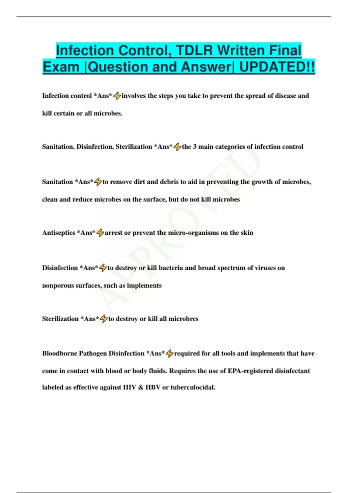 Infection Control, TDLR Written Final Exam |Question and Answer| UPDATED!!