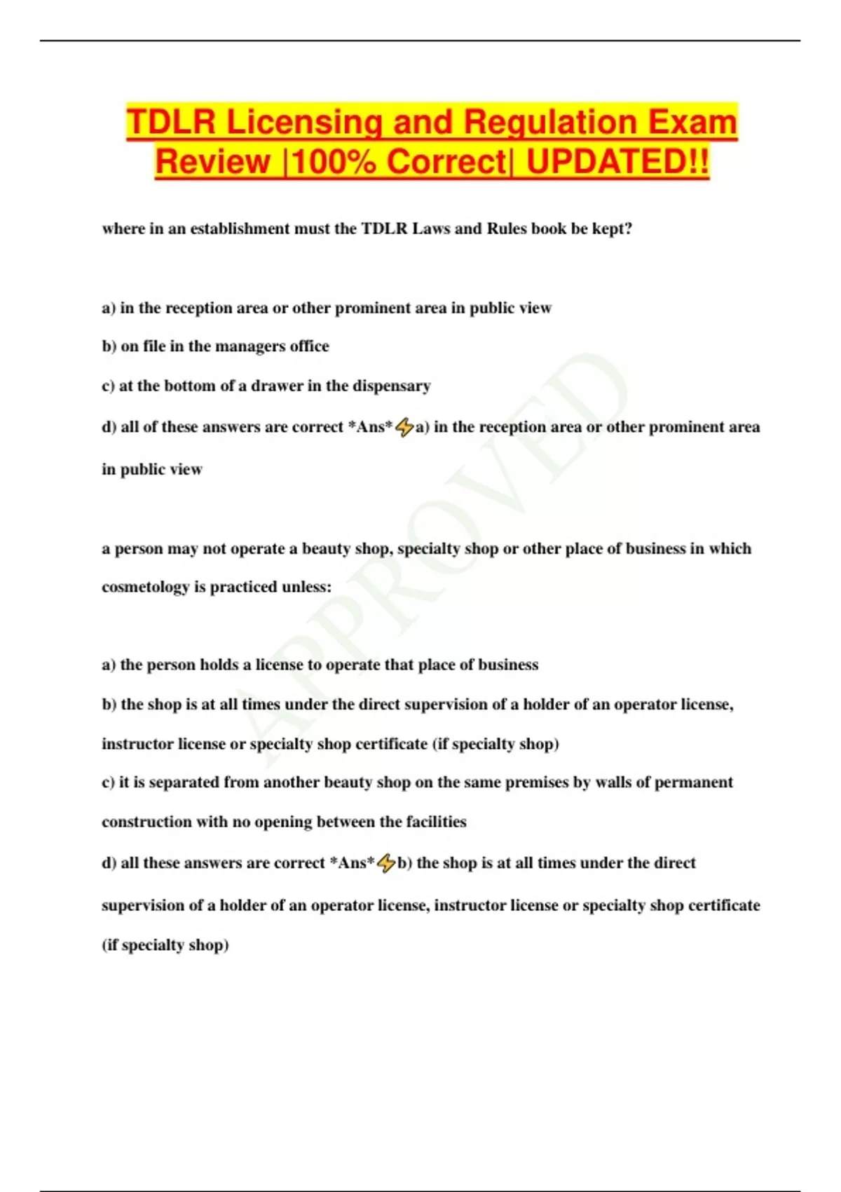 TDLR Licensing and Regulation Exam Review |100% Correct| UPDATED!! where in an establishment must the TDLR Laws and Rules book be kept? a) in the reception area or other prominent area in public view b) on file in the managers office c) at the bottom of a drawer in the dispensary d) all of these answers are correct *Ans* a) in the reception area or other prominent area in public view a person may not operate a beauty shop, specialty shop or other place of business in which cosmetology is practiced unless: a) the person holds a license to operate that place of business b) the shop is at all times under the direct supervision of a holder of an operator license, instructor license or specialty shop certificate (if specialty shop) c) it is separated from another beauty shop on the same premises by walls of permanent construction with no opening between the facilities d) all these answers are correct *Ans* b) the shop is at all times under the direct supervision of a holder of an operator license, instructor license or specialty shop certificate (if specialty shop) which of the following duties is required of a license holder? a) offer food and beverage to the client b) comply with health and safety standards c) provide continuing education d) all of these answers are correct *Ans* b) comply with health and safety standards the applicant is eligible for a license if they have: a) a high school diploma b) a ged certificate c) passed an exam that measures their ability to benefit from training d) any of these are correct *Ans* d) any of these are correct to be eligible for a license, an applicant must: a) pass a written and practical exam b) be at least 17 years of age c) submit a completed application on a department-approved form d) all of these are correct *Ans* d) all of these are correct a licensee may not perform services on a client if the client has a contagious condition such as: a) lice b) dandruff c) cancer d) acne simplex *Ans* a) lic