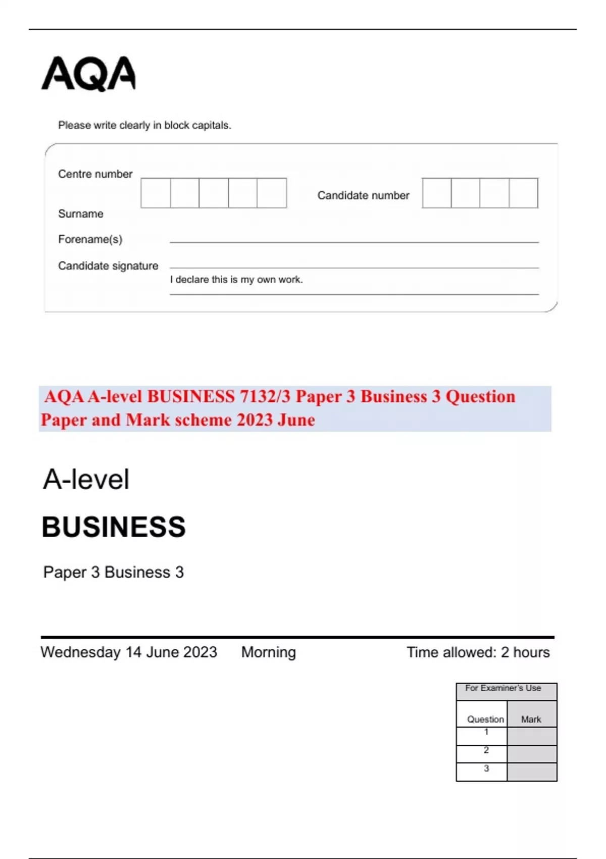 AQA A-level BUSINESS 7132/3 Paper 3 Business 3 Question Paper and Mark scheme 2023 June