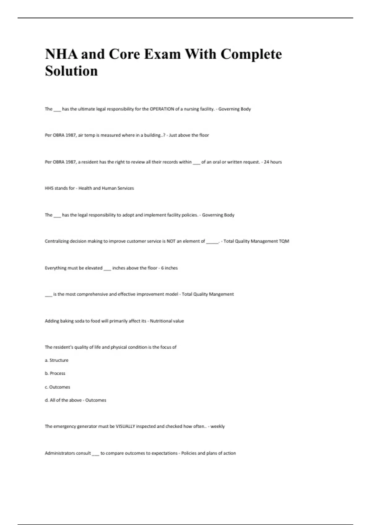 NHA and Core Exam With Complete Solution The ___ has the ultimate legal responsibility for the OPERATION of a nursing facility Per OBRA 1987, air temp is measured where in a building.....