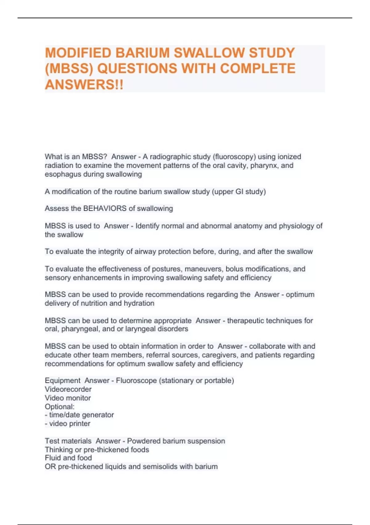 MODIFIED BARIUM SWALLOW STUDY (MBSS) QUESTIONS WITH COMPLETE ANSWERS!!