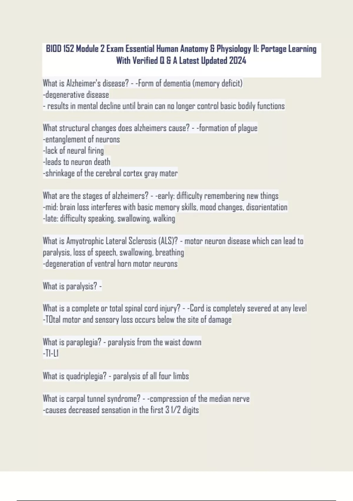 BIOD 152 Module 2 Exam Essential Human Anatomy & Physiology II: Portage Learning With Verified Q & A Latest Updated 2024 What is Alzheimer's disease? - -Form of dementia (memory deficit) -degenerative disease - results in mental decline until brain can no longer control basic bodily functions What structural changes does alzheimers cause? - -formation of plague -entanglement of neurons -lack of neural firing -leads to neuron death -shrinkage of the cerebral cortex gray mater What are the stages of alzheimers? - -early: difficulty remembering new things -mid: brain loss interferes with basic memory skills, mood changes, disorientation -late: difficulty speaking, swallowing, walking What is Amyotrophic Lateral Sclerosis (ALS)? - motor neuron disease which can lead to paralysis, loss of speech, swallowing, breathing -degeneration of ventral horn motor neurons What is paralysis? - What is a complete or total spinal cord injury? - -Cord is completely severed at any level -TOtal motor and sensory loss occurs below the site of damage What is paraplegia? - paralysis from the waist downn -T1-L1 What is quadriplegia? - paralysis of all four limbs What is carpal tunnel syndrome? - -compression of the median nerve -causes decreased sensation in the first 3 1/2 digits What is claw hand? - -damage to ular nerve -inability to open 4th and 5th digit What is sciatica? - -Pressure on the sciatic nerve from the surrounding muscles -causes pain in lower pelvis down to posterior thigh What is paralysis? - Loss of motor and sensory function caused by localized damage to spinal cord or spinal nerves Name the 4 brain divisions - Cerebrum, brainstem, diencephalon, cerebellum Name the ventricles of the brain -2 lateral ventricles, third ventricle, fourth ventricle What are brain ventricles - Protective cavity of brain filled with CSF Name the 3 meningeal layers of the brain - dura mater, arachnoid mater, pia mater What is the dura mater and subdural space?- in brain - Dura: outermost layer, double later Subdural: space below dura What is the arachnoid meninx and subarachnoid space?- in brain - arachnoid: loose layer of connective tissue below the dura subarachnoid: space below arachnoid, contains blood vessels and CSF What is the pia mater?- in brain - Thin connective tissue attached to brain, below the arachnoid What is the choroid plexus? - Network of blood vessels in ventricles of the brain List functions of CSF - Protects chemical enviro, allows brain to float, cushions brain and spinal cord