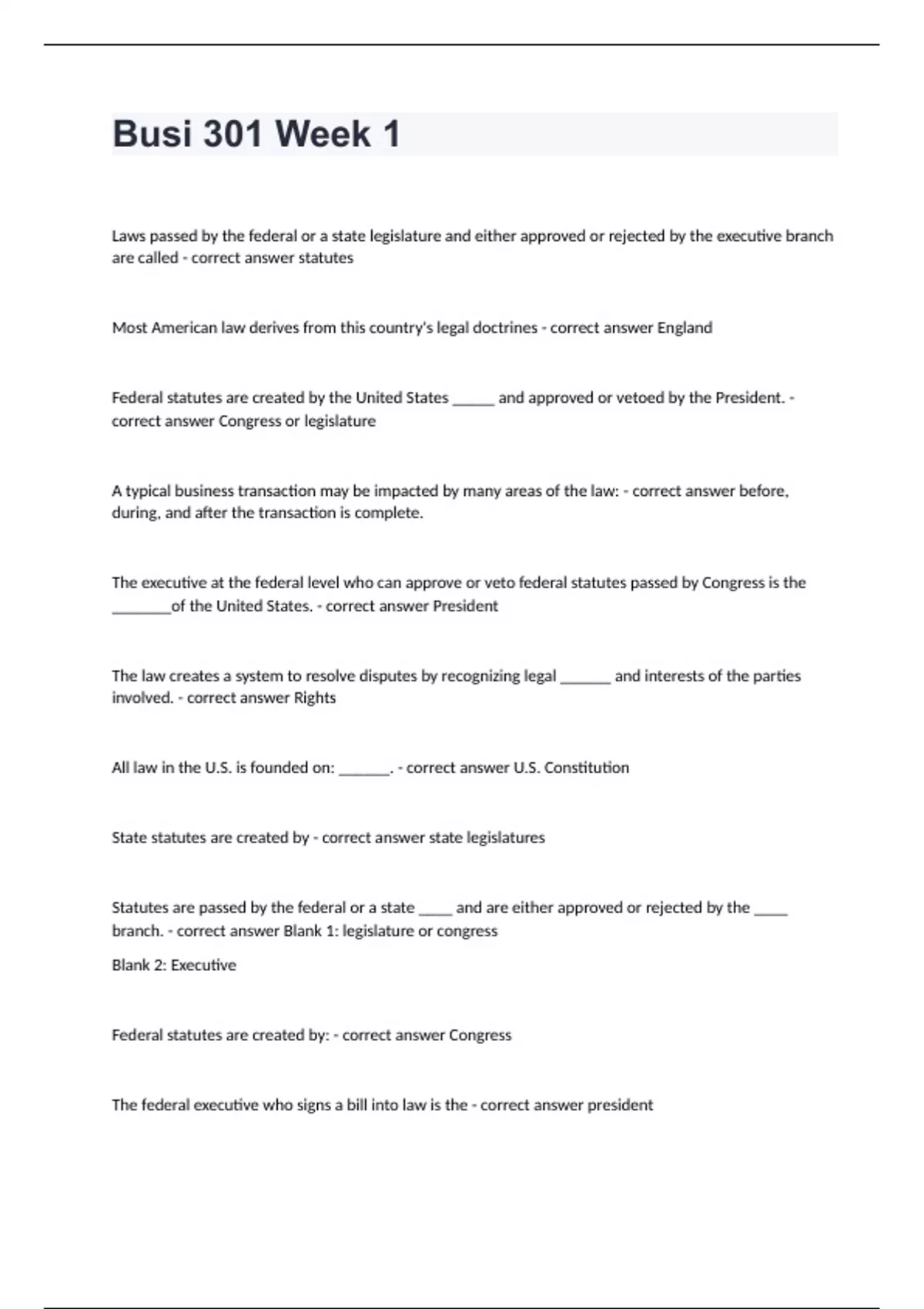 Busi 301 Week 1 Liberty University - Questions with complete solution Busi 301 Week 1 Laws passed by the federal or a state legislature and either approved or rejected by the executive branch are called - correct answer statutes Most American law derives from this country's legal doctrines - correct answer England Federal statutes are created by the United States _____ and approved or vetoed by the President. - correct answer Congress or legislature A typical business transaction may be impacted by many areas of the law: - correct answer before, during, and after the transaction is complete. The executive at the federal level who can approve or veto federal statutes passed by Congress is the _______of the United States. - correct answer President The law creates a system to resolve disputes by recognizing legal ______ and interests of the parties involved. - correct answer Rights All law in the U.S. is founded on: ______. - correct answer U.S. Constitution State statutes are created by - correct answer state legislatures