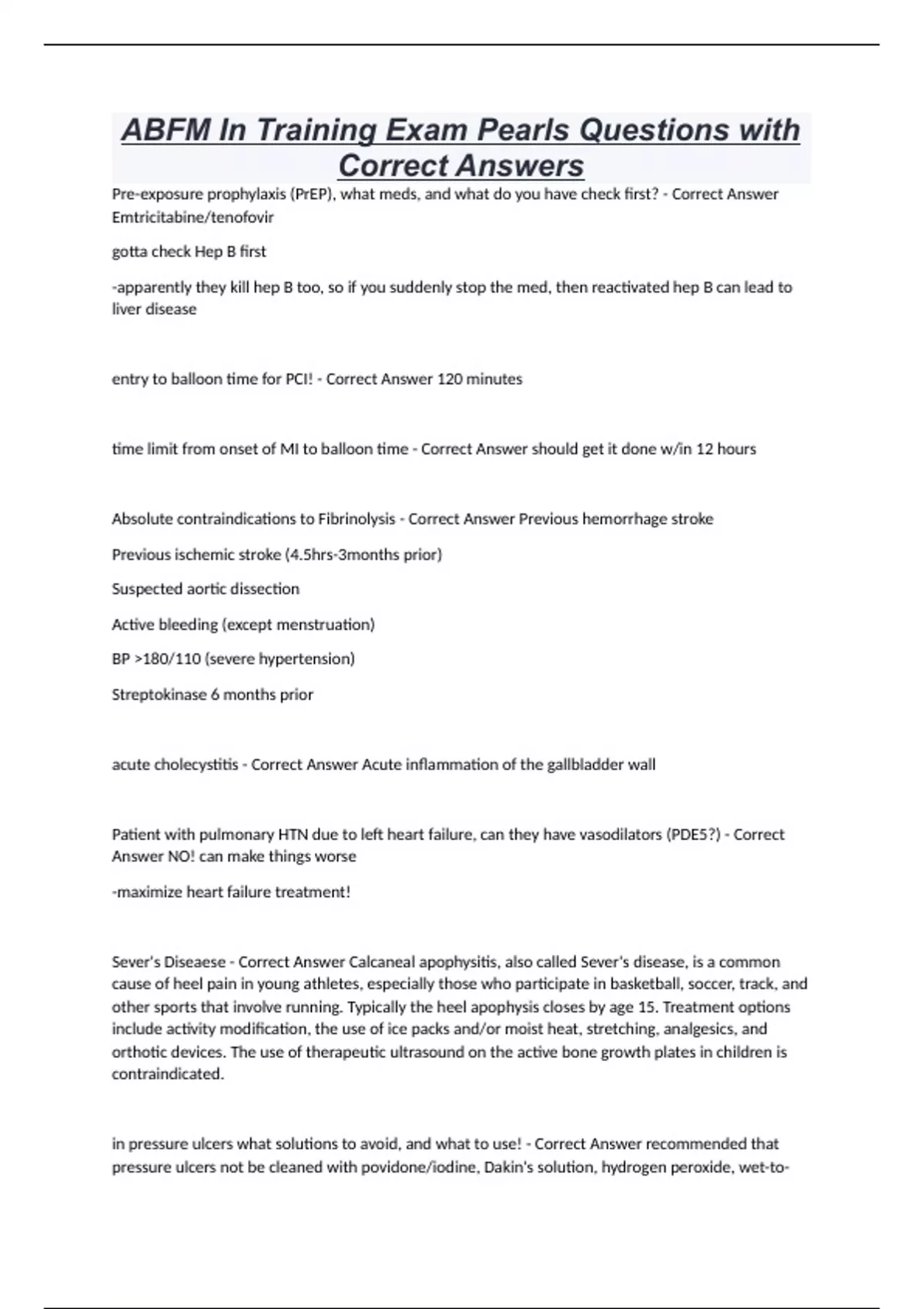 ABFM In Training Exam Pearls Questions with Correct Answers Pre-exposure prophylaxis (PrEP), what meds, and what do you have check first? - Correct Answer Emtricitabine/tenofovir gotta check Hep B first -apparently they kill hep B too, so if you suddenly stop the med, then reactivated hep B can lead to liver disease entry to balloon time for PCI! - Correct Answer 120 minutes time limit from onset of MI to balloon time - Correct Answer should get it done w/in 12 hours Absolute contraindications to Fibrinolysis - Correct Answer Previous hemorrhage stroke Previous ischemic stroke (4.5hrs-3months prior) Suspected aortic dissection Active bleeding (except menstruation) BP >180/110 (severe hypertension) Streptokinase 6 months prior acute cholecystitis - Correct Answer Acute inflammation of the gallbladder wall Patient with pulmonary HTN due to left heart failure, can they have vasodilators (PDE5?) - Correct Answer NO! can make things worse -maximize heart failure treatment! Sever's Diseaese - Correct Answer Calcaneal apophysitis, also called Sever's disease, is a common cause of heel pain in young athletes, especially those who participate in basketball, soccer, track, and other sports that involve running. Typically the heel apophysis closes by age 15. Treatment options include activity modification, the use of ice packs and/or moist heat, stretching, analgesics, and orthotic devices. The use of therapeutic ultrasound on the active bone growth plates in children is contraindicated. in pressure ulcers what solutions to avoid, and what to use! - Correct Answer recommended that pressure ulce
