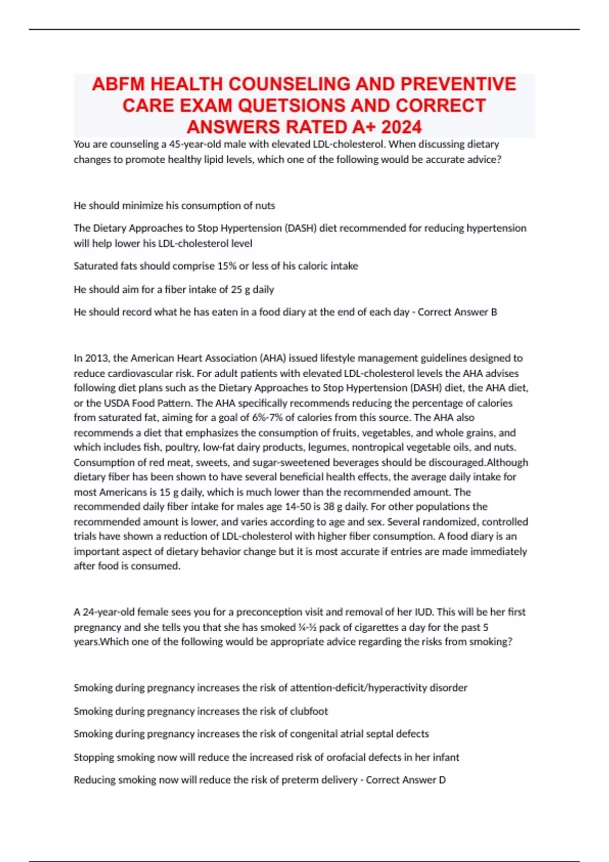 ABFM HEALTH COUNSELING AND PREVENTIVE CARE EXAM QUETSIONS AND CORRECT ANSWERS RATED A+ 2024 You are counseling a 45-year-old male with elevated LDL-cholesterol. When discussing dietary changes to promote healthy lipid levels, which one of the following would be accurate advice? He should minimize his consumption of nuts The Dietary Approaches to Stop Hypertension (DASH) diet recommended for reducing hypertension will help lower his LDL-cholesterol level Saturated fats should comprise 15% or less of his caloric intake He should aim for a fiber intake of 25 g daily He should record what he has eaten in a food diary at the end of each day - Correct Answer B In 2013, the American Heart Association (AHA) issued lifestyle management guidelines designed to reduce cardiovascular risk. For adult patients with elevated LDL-cholesterol levels the AHA advises following diet plans such as the Dietary Approaches to Stop Hypertension (DASH) diet, the AHA diet, or the USDA Food Pattern. The AHA specifically recommends reducing the percentage of calories from saturated fat, aiming for a goal of 6%-7% of calories from this source. The AHA also recommends a diet that emphasizes the consumption of fruits, vegetables, and whole grains, and which includes fish, poultry, low-fat dairy products, legumes, nontropical vegetable oils, and nuts. Consumption of red meat, sweets, and sugar-sweetened beverages should be discouraged.Although dietary fiber has been shown to have several beneficial health effects, the average daily intake for most Americans is 15 g daily, which is much lower than the recommended amount. The recommended daily fiber intake for males age 14-50 is 38 g daily. For other populations the recommended amount is lower, and varies according to age and sex. Several randomized, controlled trials have shown a reduction of LDL-cholesterol with higher fiber consumption. A food diary is an important aspect of dietary behavior change but it is most accurate if entries are made immediately after food is consumed. A 24-year-old female sees you for a preconception visit and removal of her IUD. This will be her first pregnancy and she tells you that she has smoked ¼-½ pack of cigarettes a day for the past 5 years.Which one of the following would be appropriate advice regarding the risks from smoking? Smoking during pregnancy increases the risk of attention-deficit/hyperactivity disorder Smoking during pregnancy increases the risk of clubfoot Smoking during pregnancy increases the risk of congenital atrial septal defects Stopping smoking now will reduce the increased risk of orofacial defects in her infant Reducing smoking