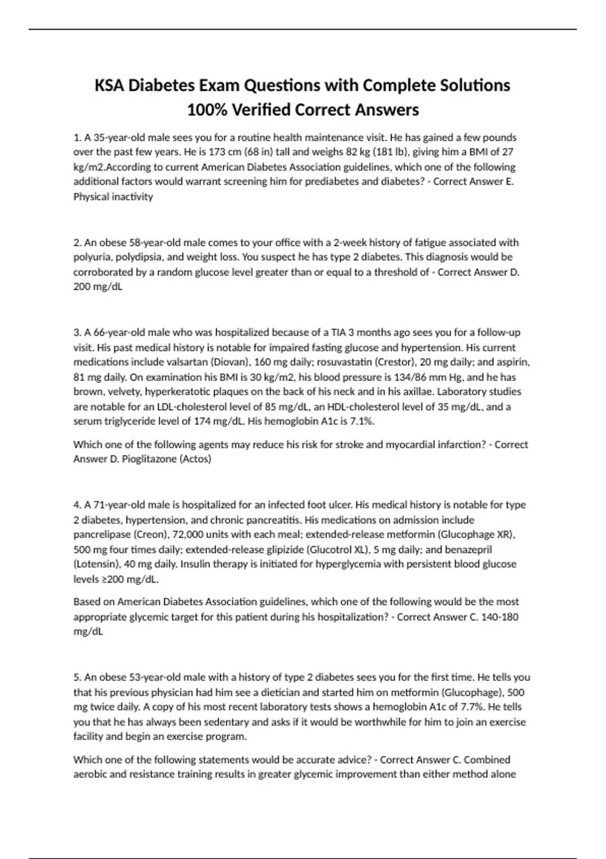 KSA Diabetes Exam Questions with Complete Solutions 100% Verified Correct Answers 1. A 35-year-old male sees you for a routine health maintenance visit. He has gained a few pounds over the past few years. He is 173 cm (68 in) tall and weighs 82 kg (181 lb), giving him a BMI of 27 kg/m2.According to current American Diabetes Association guidelines, which one of the following additional factors would warrant screening him for prediabetes and diabetes? - Correct Answer E. Physical inactivity 2. An obese 58-year-old male comes to your office with a 2-week history of fatigue associated with polyuria, polydipsia, and weight loss. You suspect he has type 2 diabetes. This diagnosis would be corroborated by a random glucose level greater than or equal to a threshold of - Correct Answer D. 200 mg/dL 3. A 66-year-old male who was hospitalized because of a TIA 3 months ago sees you for a follow-up visit. His past medical history is notable for impaired fasting glucose and hypertension. His current medications include valsartan (Diovan), 160 mg daily; rosuvastatin (Crestor), 20 mg daily; and aspirin, 81 mg daily. On examination his BMI is 30 kg/m2, his blood pressure is 134/86 mm Hg, and he has brown, velvety, hyperkeratotic plaques on the back of his neck and in his axillae. Laboratory studies are notable for an LDL-cholesterol level of 85 mg/dL, an HDL-cholesterol level of 35 mg/dL, and a serum triglyceride level of 174 mg/dL. His hemoglobin A1c is 7.1%. Which one of the following agents may reduce his risk for stroke and myocardial infarction? - Correct Answer D. Pioglitazone (Actos) 4. A 71-year-old male is hospitalized for an infected foot ulcer. His medical history is notable for type 2 diabetes, hypertension, and chronic pancreatitis. His medications on admission include pancrelipase (Creon), 72,000 units with each meal; extended-release metformin (Glucophage XR), 500 mg four times daily; extended-release glipizide (Glucotrol XL), 5 mg daily; and benazepril (Lotensin), 40 mg daily. Insulin therapy is initiated for hyperglycemia with persistent blood glucose levels ≥200 mg/dL. Based on American Diabetes Association guidelines, which one of the following would be the most appropriate glycemic target for this patient during his hospitalization? - Correct Answer C. 140-180 mg/dL 5. An obese 53-year-old male with a history of type 2 diabetes sees you for the first time. He tells you that his previous physician had him see a dietician and started him on metformin (Glucophage), 500 mg twice daily. A copy of his most recent laboratory tests shows a hemoglobin A1c of 7.7%. He tells you that he has always been sedentary and asks if it would be worthwhile for him to join an exercise facility and begin an exercise program. Which one of the following statements would be accurate advice? - Correct Answer C. Combined aerobic and resistance