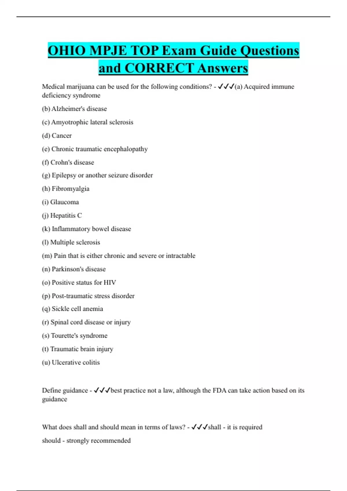 Medical marijuana can be used for the following conditions? - (a) Acquired immune deficiency syndrome (b) Alzheimer's disease (c) Amyotrophic lateral sclerosis (d) Cancer (e) Chronic traumatic encephalopathy (f) Crohn's disease (g) Epilepsy or another seizure disorder (h) Fibromyalgia (i) Glaucoma (j) Hepatitis C (k) Inflammatory bowel disease (l) Multiple sclerosis (m) Pain that is either chronic and severe or intractable (n) Parkinson's disease (o) Positive status for HIV (p) Post-traumatic stress disorde