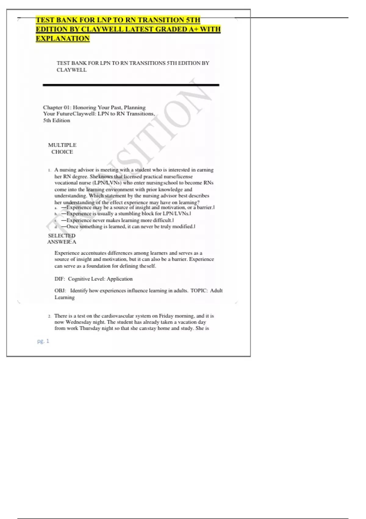 Test Bank For LPN to RN Transitions 5th Edition By Lora Claywell 9780323697972 Chapter 1-18 Complete Guide .