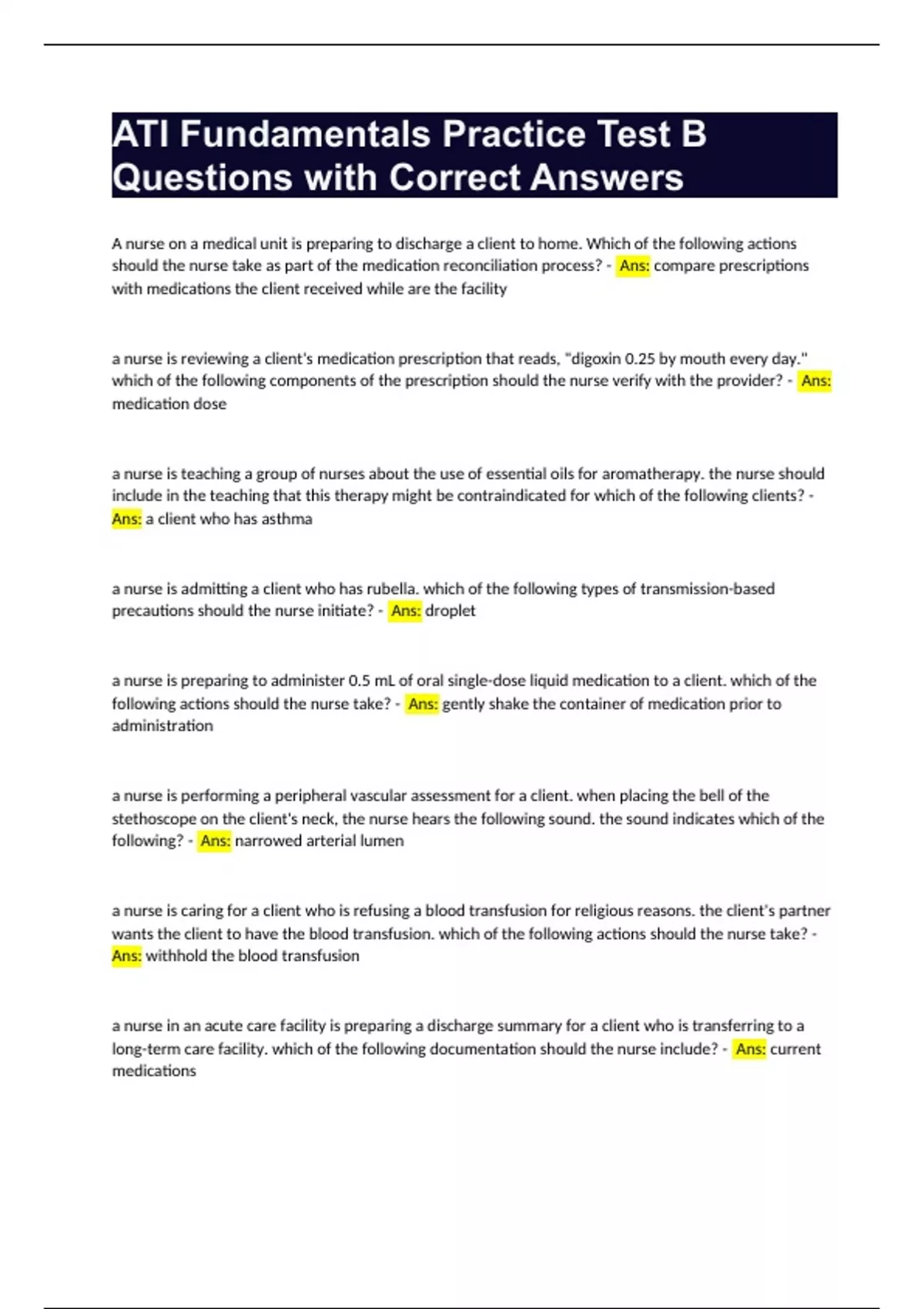 ATI Fundamentals Practice Test B Questions with Correct Answers