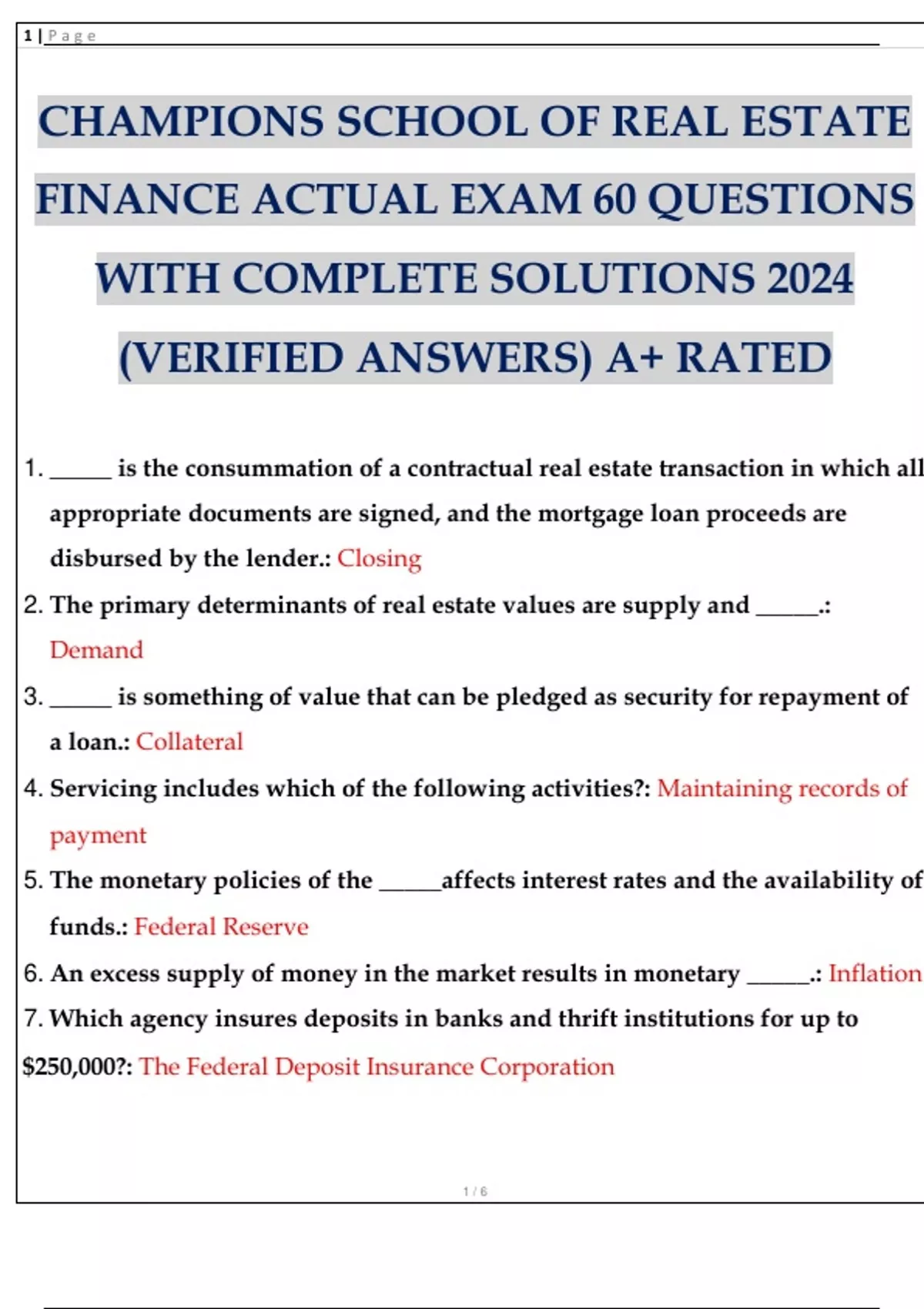 CHAMPIONS SCHOOL OF REAL ESTATE FINANCE ACTUAL EXAM 60 QUESTIONS WITH COMPLETE SOLUTIONS 2024 (VERIFIED ANSWERS) A+ RATED.CHAMPIONS SCHOOL OF REAL ESTATE FINANCE ACTUAL EXAM 60 QUESTIONS WITH COMPLETE SOLUTIONS 2024 (VERIFIED ANSWERS) A+ RATED.