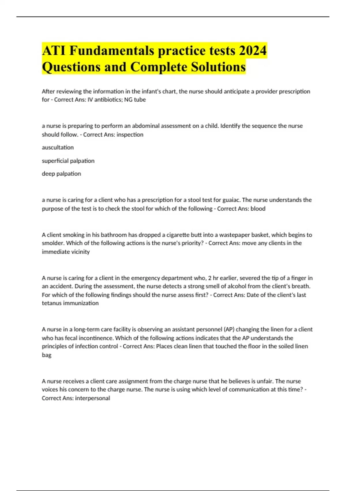 ATI Fundamentals practice tests 2024 Questions and Complete Solutions.
