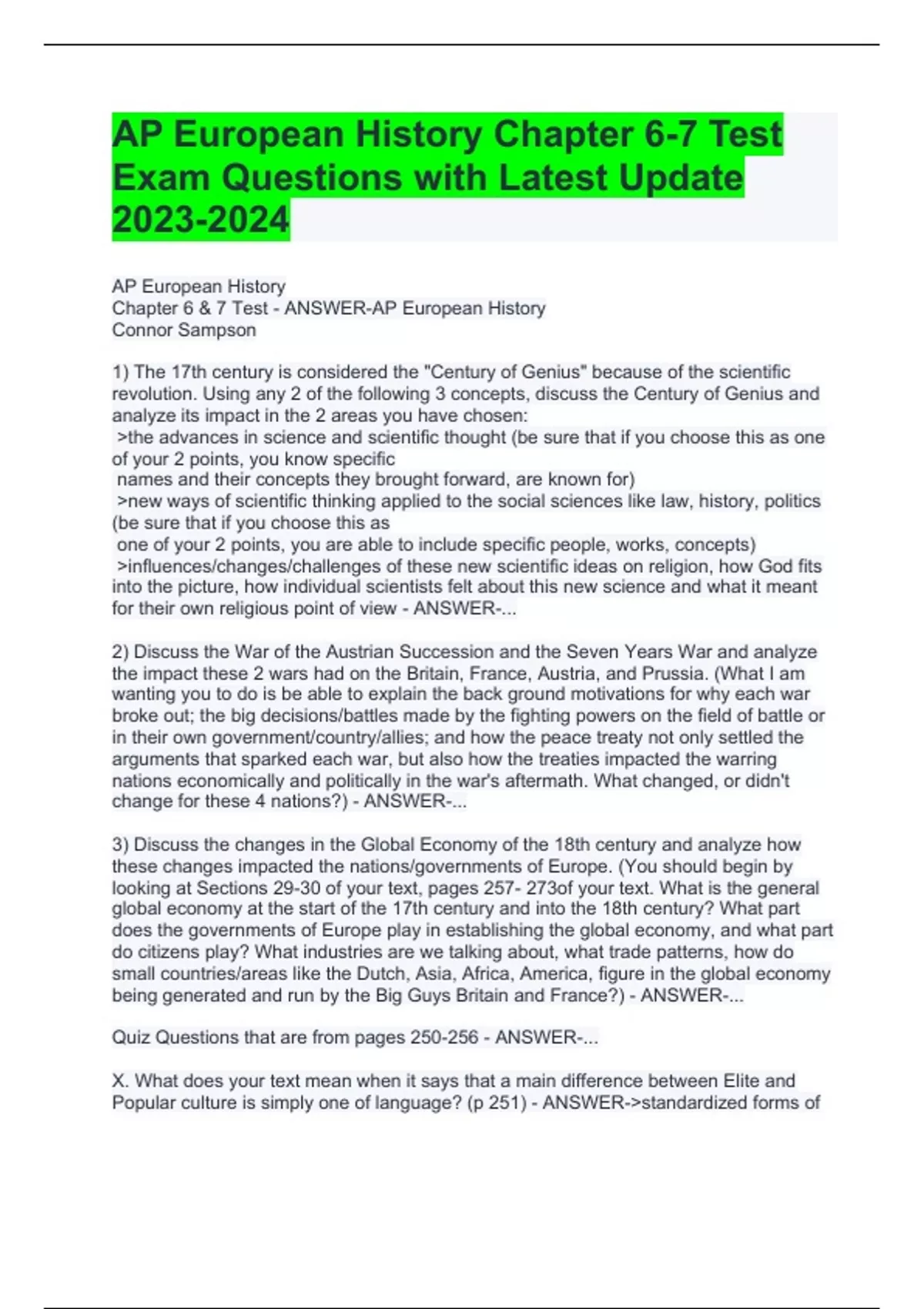 AP European History Chapter 6 & 7 Test - ANSWER-AP European History Connor Sampson 1) The 17th century is considered the "Century of Genius" because of the scientific revolution. Using any 2 of the following 3 concepts, discuss the Century of Genius and analyze its impact in the 2 areas you have chosen: >the advances in science and scientific thought (be sure that if you choose this as one of your 2 points, you know specific names and their concepts they brought forward, are known for) >new ways of scientific thinking applied to the social sciences like law, history, politics (be sure that if you choose this as one of your 2 points, you are able to include specific people, works, concepts) >influences/changes/challenges of these new scientific ideas on religion, how God fits into the picture, how individual scientists felt about this new science and what it meant for their own religious point of view - ANSWER-... 2) Discuss the War of the Austrian Succession and the Seven Years War and analyze the impact these 2 wars had on the Britain, France, Austria, and Prussia. (What I am wanting you to do is be able to explain the back ground motivations for why each war broke out; the big decisions/battles made by the fighting powers on the field of battle or in their own government/country/allies; and how the peace treaty not only settled the arguments that sparked each war, but also how the treaties impacted the warring nations economically and politically in the war's aftermath. What changed, or didn't change for these 4 nations?) - ANSWER-... 3) Discuss the changes in the Global Economy of the 18th century and analyze how these changes impacted the nations/governments of Europe. (You should begin by looking at Sections 29-30 of your text, pages 257- 273of your text. What is the general global economy at the start of the 17th century and into the 18th century? What part does the governments of Europe play in establishing the global economy, and what part do citizens play? What industries are we talking about, what trade patterns, how do small countries/areas like the Dutch, Asia, Africa, America, figure in the global economy being generated and run by the Big Guys Britain and France?) - ANSWER-... Quiz Questions that are from pages 250-256 - ANSWER-... X. What does your text mean when it says that a main difference between Elite and Popular culture is simply one of language? (p 251) - ANSWER->standardized forms