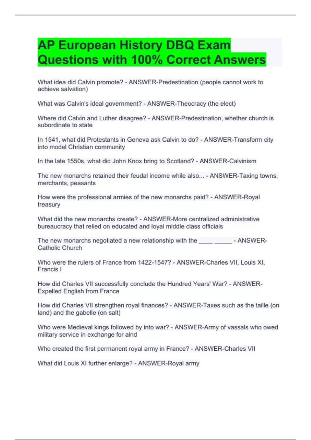 What idea did Calvin promote? - ANSWER-Predestination (people cannot work to achieve salvation) What was Calvin's ideal government? - ANSWER-Theocracy (the elect) Where did Calvin and Luther disagree? - ANSWER-Predestination, whether church is subordinate to state In 1541, what did Protestants in Geneva ask Calvin to do? - ANSWER-Transform city into model Christian community In the late 1550s, what did John Knox bring to Scotland? - ANSWER-Calvinism The new monarchs retained their feudal income while also... - ANSWER-Taxing towns, merchants, peasants How were the professional armies of the new monarchs paid? - ANSWER-Royal treasury What did the new monarchs create? - ANSWER-More centralized administrative bureaucracy that relied on educated and loyal middle class officials The new monarchs negotiated a new relationship with the ____ _____ - ANSWER-Catholic Church Who were the rulers of France from ? - ANSWER-Charles VII, Louis XI, Francis I How did Charles VII successfully conclude the Hundred Years' War? - ANSWER-Expelled English from France How did Charles VII strengthen royal finances? - ANSWER-Taxes such as the taille (on land) and the gabelle (on salt) Who were Medieval kings followed by into war? - ANSWER-Army of vassals who owed military service in exchange for alnd Who created the first permanent royal army in France? - ANSWER-Charles VII What did Louis XI further enlarge? - ANSWER-Royal army