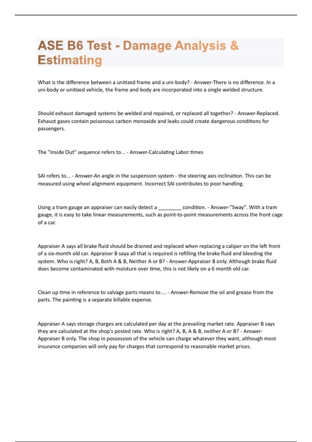 What is the difference between a unitized frame and a uni-body? - Answer-There is no difference. In a uni-body or unitized vehicle, the frame and body are incorporated into a single welded structure. Should exhaust damaged systems be welded and repaired, or replaced all together? - Answer-Replaced. Exhaust gases contain poisonous carbon monoxide and leaks could create dangerous conditions for passengers. The "Inside Out" sequence refers to... - Answer-Calculating Labor times SAI refers to... - Answer-An angle in the suspension system - the steering axis inclination. This can be measured using wheel alignment equipment. Incorrect SAI contributes to poor handling. Using a tram gauge an appraiser can easily detect a ________ condition. - Answer-"Sway". With a tram gauge, it is easy to take linear measurements, such as point-to-point measurements across the front cage of a car. Appraiser A says all brake fluid should be drained and replaced when replacing a caliper on the left front of a six-month old car. Appraiser B saya all that is required is refilling the brake fluid and bleeding the system. Who is right? A, B, Both A & B, Neither A or B? - Answer-Appraiser B only. Although brake fluid does become contaminated with moisture over time, this is not likely on a 6 month old car. Clean up time in reference to salvage parts means to.... - Answer-Remove the oil and grease from the parts. The painting is a separate billable expense. Appraiser A says storage charges are calculated per day at the prevailing market rate. Appraiser B says they are calculated at the shop's posted rate. Who is right? A, B, A & B, neither A or B? - AnswerAppraiser B only. The shop in possession of the vehicle can charge whatever they want, although most insurance companies will only pay for charges that correspond to reasonable market prices.Appraiser A Says the factory E-coat corrosion protection must be replaced anytime it is damaged in a collision. Appraiser B says the E-coat must be restored to a level equivalent to that created at the factory. Who is right? A, B, A & B, neither A or B? - Answer-Both A & B. The factory E-coat must always be replaced when damaged and it must be done to a level equivalent with the factory work. "Set up and measure" refers to what? - Answer-The dollar allowance for the time a technician needs to mount a vehicle on a repair system to measure length, width from center-line and height from the datum plane. What are air conditioning components generally classified as? - Answer-Mechanical items. Mechanical operations are generally those bolted items inward of the radiator. Would an alternator be classified as a "betterment" item? - Answer-No. Betterment applies to normal wear & tear items that a vehicle owner should expect to replace in the life of a vehicle. Example: Battery, shocks, brake linings, tires, etc. Would aftermarket paint sealant cause a problem with a vehicle warranty? - Answer-No. Example of things that could cause a problem with a vehicle warranty are: repaired wiring harness, wire splicing, etc.