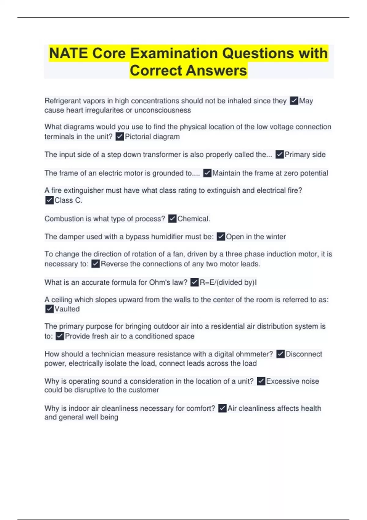 Refrigerant vapors in high concentrations should not be inhaled since they May cause heart irregularites or unconsciousness What diagrams would you use to find the physical location of the low voltage connection terminals in the unit? Pictorial diagram The input side of a step down transformer is also properly called the... Primary side The frame of an electric motor is grounded to.... Maintain the frame at zero potential A fire extinguisher must have what class rating to extinguish and electrical fire? Class C. Combustion is what type of process? Chemical. The damper used with a bypass humidifier must be: Open in the winter To change the direction of rotation of a fan, driven by a three phase induction motor, it is necessary to: Reverse the connections of any two motor leads. What is an accurate formula for Ohm's law? R=E/(divided by)I A ceiling which slopes upward from the walls to the center of the room is referred to as: Vaulted The primary purpose for bringing outdoor air into a residential air distribution system is to: Provide fresh air to a conditioned space How should a technician measure resistance with a digital ohmmeter? Disconnect power, electrically isolate the load, connect leads across the load Why is operating sound a consideration in the location of a unit? Excessive noise could be disruptive to the customer Why is indoor air cleanliness necessary for comfort? Air cleanliness affects health and general well being