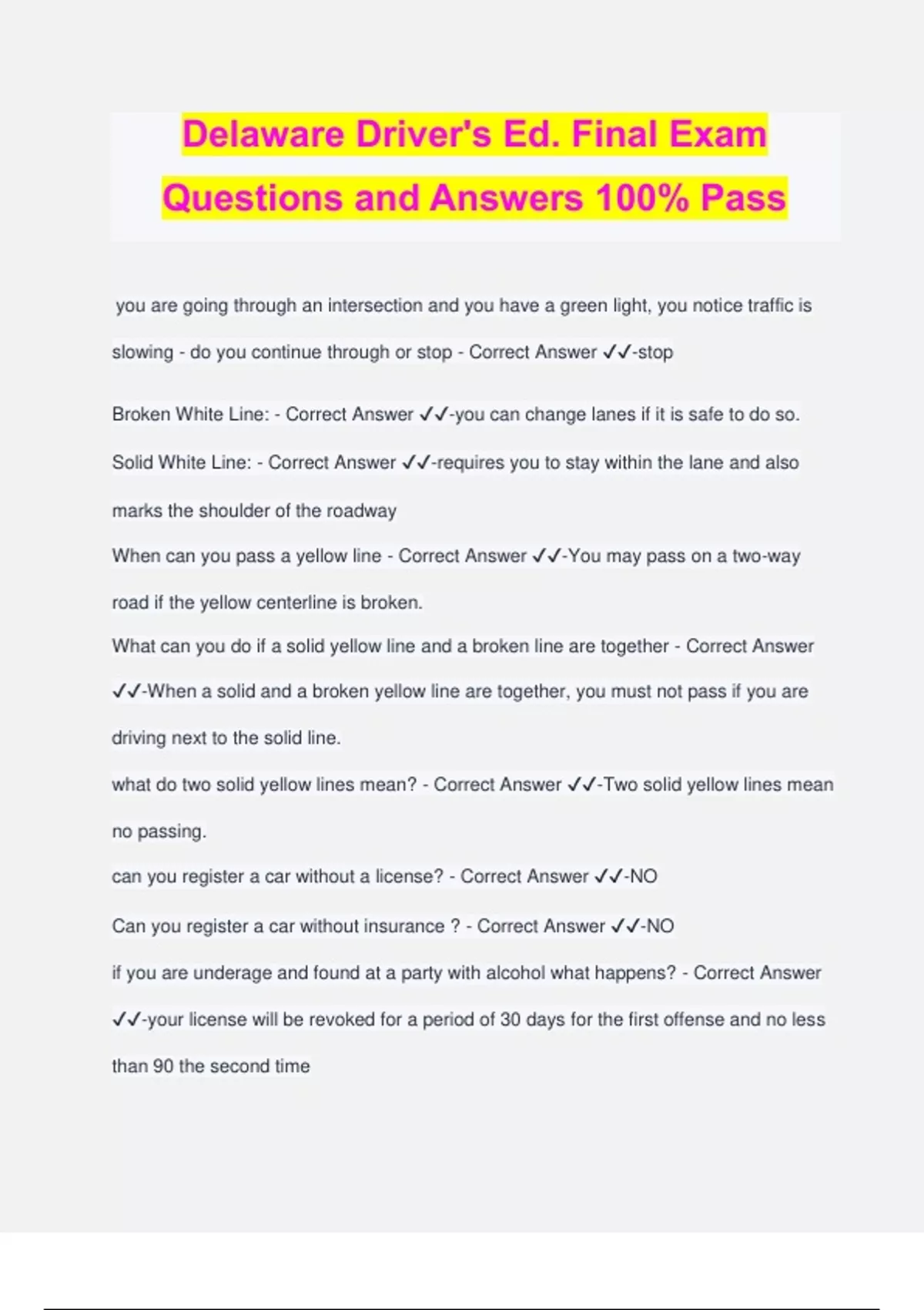 Delaware Driver's Ed. Final Exam Questions and Answers 100% Pass you are going through an intersection and you have a green light, you notice traffic is slowing - do you continue through or stop - Correct Answer ️️ -stop Broken White Line: - Correct Answer ️️ -you can change lanes if it is safe to do so. Solid White Line: - Correct Answer ️️ -requires you to stay within the lane and also marks the shoulder of the roadway When can you pass a yellow line - Correct Answer ️️ -You may pass on a two-way road if the yellow centerline is broken. What can you do if a solid yellow line and a broken line are together - Correct Answer ️️ -When a solid and a broken yellow line are together, you must not pass if you are driving next to the solid line. what do two solid yellow lines mean? - Correct Answer ️️ -Two solid yellow lines mean no passing. can you register a car without a license? - Correct Answer ️️ -NO Can you register a car without insurance ? - Correct Answer ️️ -NO if you are underage and found at a party with alcohol what happens? - Correct Answer ️️ -your license will be revoked for a period of 30 days for the first offense and no less than 90 the second time when is the road more slippery in a rainstorm - Correct Answer ️️ -in the beginning because the rain hasn't washed the oils off the road yet why should you give yourself space between you and the car infront of you when at a red light - Correct Answer ️️ -because if a ambulance comes along then you need to be able to get out of the way what is the fine for not restraining a child with safety belts ? - Correct Answer ️️ -83.50 delaware law requires every child under the age of _______ to be restrained properly - Correct Answer ️️ -16 what age or weight do children have to be in a booster seat - Correct Answer ️️ -age eight or 65lbs how much is the fine for failing to restrain your child in a seat in a moving car - Correct Answer ️️ -83.50 , plus court cost What group of kids cannot sit in the front seat - Correct Answer ️️ -under age 12 and 65 inches in hight what car seat does birth - 12 month year old need - Correct Answer ️️ -rear facing car seat 1-3 year old car seat - Correct Answer ️️ -rear facing seat until no longer possible, then use booster 8-12 year old car seat - Correct Answer ️️ -until they are big enough to sit with a seatbelt properly keep them in the booster seat what is the best thing to do when you are tired and driving - Correct Answer ️️ -to rest or change drivers what are some signs of drowsy driving - Correct Answer ️️ -when your eyes close or go out of focus by themselves when you have trouble keeping your head up when you can't stop yawning you have wandering disconnected thoughts you don't remember driving the last few miles you keep driving out of your lane When left on red is permitted - Correct Answer ️️ -one lane roads - there is no on- coming traffic rolling left hand turn - when you are not in a controlled intersection- you don't have a stop sign or a light- - Correct Answer ️️ -yield to on-coming traffic you are doing a rolling left hand turn, you are stopped and yielding to on coming traffic. how should your wheels be turned? - Correct Answer ️️ -straight You get into a minor fender bender, and there is only a scratch- do you call