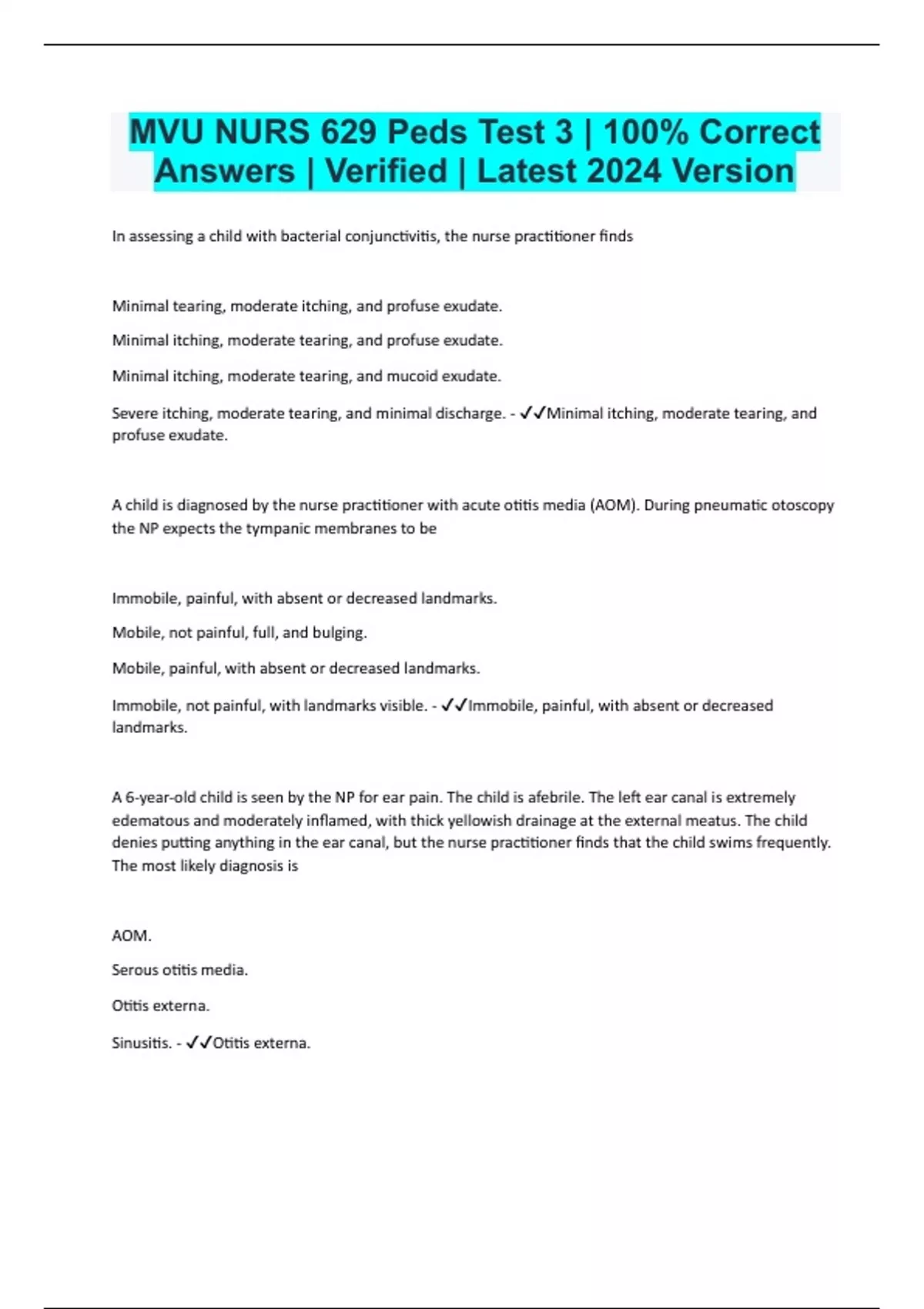 MVU NURS 629 Peds Test 3 | 100% Correct Answers | Verified | Latest 2024 Version