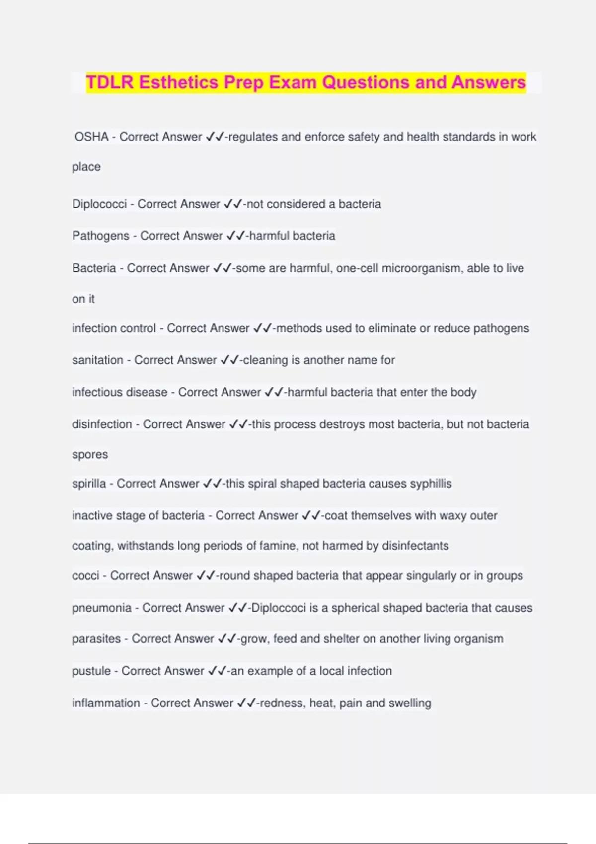 TDLR Esthetics Prep Exam Questions and Answers OSHA - Correct Answer ️️ -regulates and enforce safety and health standards in work place Diplococci - Correct Answer ️️ -not considered a bacteria Pathogens - Correct Answer ️️ -harmful bacteria Bacteria - Correct Answer ️️ -some are harmful, one-cell microorganism, able to live on it infection control - Correct Answer ️️ -methods used to eliminate or reduce pathogens sanitation - Correct Answer ️️ -cleaning is another name for infectious disease - Correct Answer ️️ -harmful bacteria that enter the body disinfection - Correct Answer ️️ -this process destroys most bacteria, but not bacteria spores spirilla - Correct Answer ️️ -this spiral shaped bacteria causes syphillis inactive stage of bacteria - Correct Answer ️️ -coat themselves with waxy outer coating, withstands long periods of famine, not harmed by disinfectants cocci - Correct Answer ️️ -round shaped bacteria that appear singularly or in groups pneumonia - Correct Answer ️️ -Diploccoci is a spherical shaped bacteria that causes parasites - Correct Answer ️️ -grow, feed and shelter on another living organism pustule - Correct Answer ️️ -an example of a local infection inflammation - Correct Answer ️️ -redness, heat, pain and swelling white blood cells, bacteria and dead cells - Correct Answer ️️ -contaminants in pus bacilli - Correct Answer ️️ -common bacteria that affects humans HIV/AIDS and Hepatitis - Correct Answer ️️ -bloodborne pathogens viruses differ from bacteria by - Correct Answer ️️ -the live and reproduce by taking over other cells virus - Correct Answer ️️ -parasitic submicroscopic particle that infects and resides in the cells of a biological organism communicable - Correct Answer ️️ -contagious disease spreads from one person to another plantar warts - Correct Answer ️️ -Human Papillomavirus is the