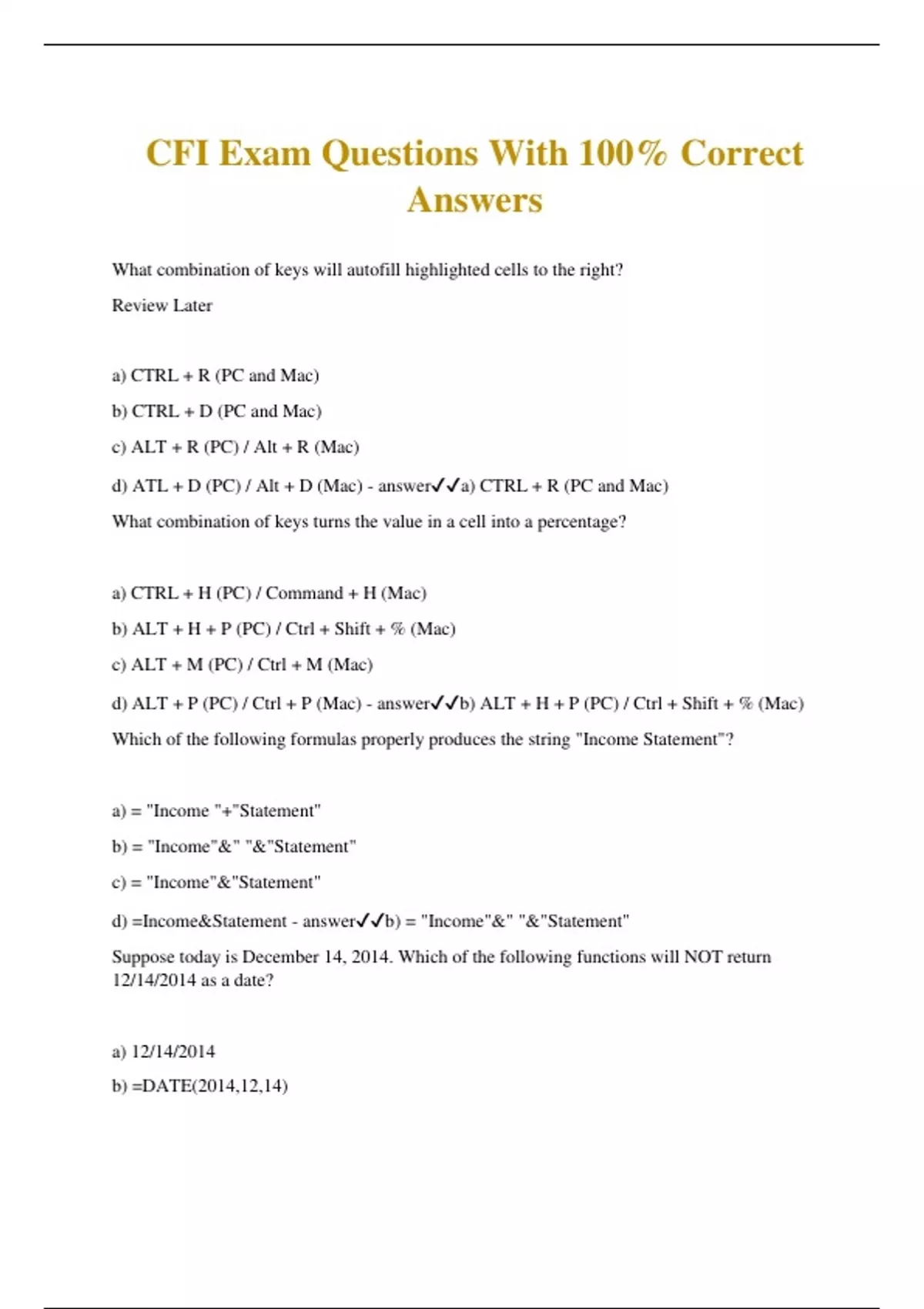 CFI Exam Questions With 100% Correct Answers What combination of keys will autofill highlighted cells to the right? Review Later a) CTRL + R (PC and Mac) b) CTRL + D (PC and Mac) c) ALT + R (PC) / Alt + R (Mac) d) ATL + D (PC) / Alt + D (Mac) - answera) CTRL + R (PC and Mac) What combination of keys turns the value in a cell into a percentage? a) CTRL + H (PC) / Command + H (Mac) b) ALT + H + P (PC) / Ctrl + Shift + % (Mac) c) ALT + M (PC) / Ctrl + M (Mac) d) ALT + P (PC) / Ctrl + P (Mac) - answerb) ALT + H + P (PC) / Ctrl + Shift + % (Mac) Which of the following formulas properly produces the string "Income Statement"? a) = "Income "+"Statement" b) = "Income"&" "&"Statement" c) = "Income"&"Statement" d) =Income&Statement - answerb) = "Income"&" "&"Statement" Suppose today is December 14, 2014. Which of the following functions will NOT return 12/14/2014 as a date? a) 12/14/2014 b) =DATE(2014,12,14)