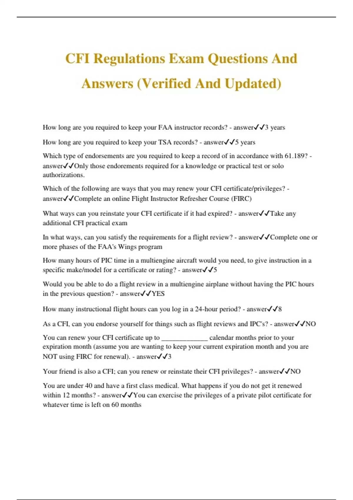 CFI Regulations Exam Questions And Answers (Verified And Updated) How long are you required to keep your FAA instructor records? - answer3 years How long are you required to keep your TSA records? - answer5 years Which type of endorsements are you required to keep a record of in accordance with 61.189? - answerOnly those endorements required for a knowledge or practical test or solo authorizations. Which of the following are ways that you may renew your CFI certificate/privileges? - answerComplete an online Flight Instructor Refresher Course (FIRC) What ways can you reinstate your CFI certificate if it had expired? - answerTake any additional CFI practical exam In what ways, can you satisfy the requirements for a flight review? - answerComplete one or more phases of the FAA's Wings program How many hours of PIC time in a multiengine aircraft would you need, to give instruction in a specific make/model for a certificate