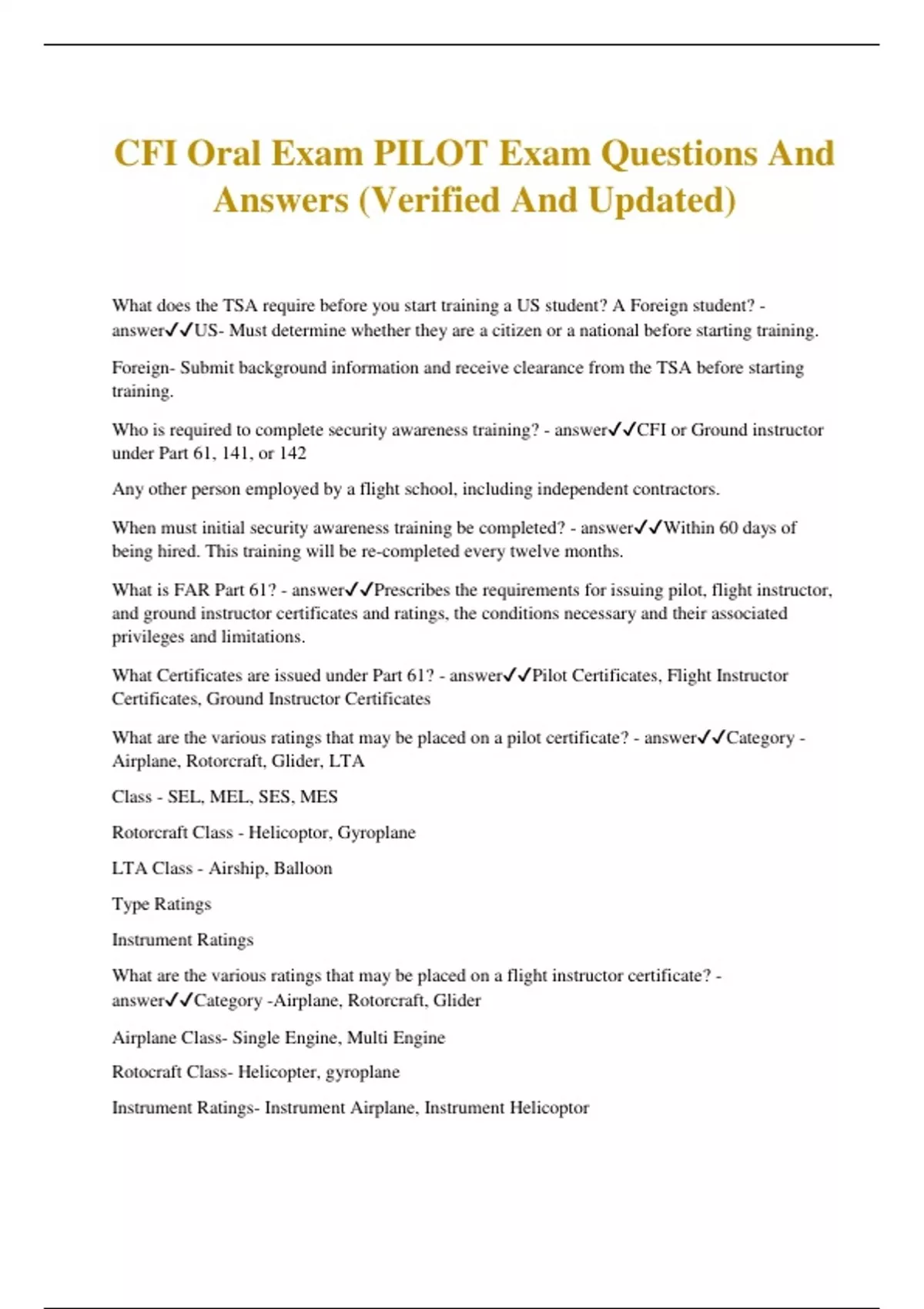 CFI Oral Exam PILOT Exam Questions And Answers (Verified And Updated) What does the TSA require before you start training a US student? A Foreign student? - answerUS- Must determine whether they are a citizen or a national before starting training. Foreign- Submit background information and receive clearance from the TSA before starting training. Who is required to complete security awareness training? - answerCFI or Ground instructor under Part 61, 141, or 142 Any other person employed by a flight school, including independent contractors. When must initial security awareness training be completed? - answerWithin 60 days of being hired. This training will be re-completed every twelve months. What is FAR Part 61? - answerPrescribes the requirements for issuing pilot, flight instructor, and ground instructor certificates and ratings, the conditions necessary and their associated privileges and limitations. What Certificates are issued under Part 61? - answerPilot Certificates, Flight Instructor Certificates, Ground Instructor Certificates What are the various ratings that may be placed on a pilot certificate? - answerCategory - Airplane, Rotorcraft, Glider, LTA Class - SEL, MEL, SES, MES Rotorcraft Class - Helicoptor, Gyroplane LTA Class - Airship, Balloon Type Ratings Instrument Ratings What are the various ratings that may be placed on a flight instructor certificate? - answerCategory -Airplane, Rotorcraft, Glider Airplane Class- Single Engine, Multi Engine Rotocraft Class- Helicopter, gyroplane Instrument Ratings- Instrument Airplane, Instrument Helicoptor A temporary pilot Certificate is good for how many days? - answer120 days How long does a flight instructor certificate last? - answerEffective only when a pilot has a current certificate. It expires 24 months after it is issued. What are the required medical certificates? - answerFirst class - ATP Second Class-Commercial Pilot Third Class-Private/Recreational/student/flight instructor When is a medical not required? - answerWhen acting as flight instructor while not acting as PIC When acting as a ground instructor When serving as an examiner/check airmen in a sim When taking a test or check in a sim When you lose or destroy an airmen certificate/medical or knowledge test report, what procedure should you follow? - answerAn application for replacement is made by letter to the FAA By obtaining a fax from the FAA confirming it was issued. This fax may be used as a certificate for 60 days. When is a type rating required? - answerTurbojet aircraft Any aircraft certified at or above 12,500lbs. What additional training is required to act as PIC of a complex airplane? - answerReceived and logged ground and flight training in a complex airplane or FTD Received a one-time logbook endorsement certifying proficiency What additional training is required to act as PIC of a high performance airplane? - answerReceived and logged ground training in a high performance airplane or FTD Received a one time logbook endorsement certifying proficiency. What additional training is required to act as PIC of a tailwheel airplane? - answerReceived and logged flight and ground training from an authorized instructor to include: normal and crosswind takeoffs and landings, wheel landings and go around procedures. To be eligible to take and FAA knowledge test what must an applicant accomplish? - answerApplicant must have received an endorsement from an authorized instructor certifying that the applicant is prepared for the knowledge test. Must present proper ID and will meet the age requirements To be eligible for a practical test, what is the applicant required to accomplish? - answerPass the required knowledge test within 24 calendar months Present the knowledge test report at the time of the practical Have accomplished the required training and obtained the aeronautical experience required Hold at least a third class medical Meet the prescribed age requirement Have a logbook or training record endorsement within the preceding 60 days An applicant for a knowledge or practical test who fails may reapply when: - answerThe training has been complete and the applicant is proficient to pass the test An endorsement from an authorized instructor who gave the applicant the training What flight time must be documented by all pilots? - answerTraining and aeronautical experience used to meet the requirements for the certificate, rating or flight review The aeronautical experience required for meeting the recency of flight experience requirements of part 61 When can one log instrument time? - answerA person may log instrument time when the person operates the aircraft solely by reference to instruments under actual or simulated instrument flight conditions. A flight instructor may log instrument time only when in actual. What requirements must be met when conducting a flight review? - answerA flight review consists of 1 hour of flight training and one hour of ground training. This includes a review of part 91 flight rules and general operating procedures. Maneuvers and procedures that the instructor deems necessary for the pilot to demonstrate the safe exercise of the privileges of the certificate. What logbook entries should be made if the instructor deems that the pilot demonstrates unsatisfactory performance during a flight review? - answerThe instructor should sign the logbook to record the instruction given and then recommend additional training in the areas that were unsatisfactory. When is a flight review not required? - answerA pilot who has satisfactorily completed (within the preceding 24 months) a: