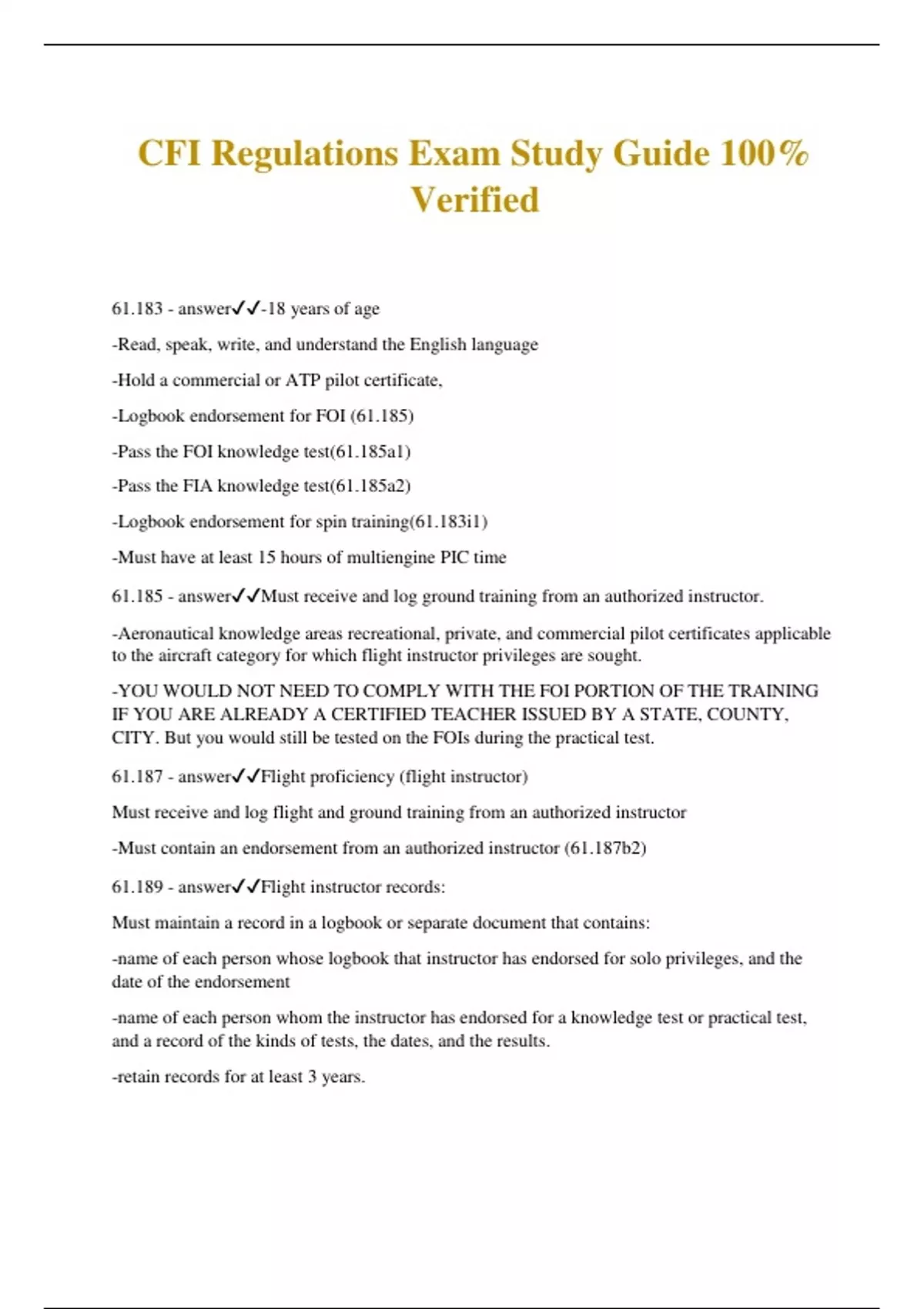 CFI Regulations Exam Study Guide 100% Verified 61.183 - answer-18 years of age -Read, speak, write, and understand the English language -Hold a commercial or ATP pilot certificate, -Logbook endorsement for FOI (61.185) -Pass the FOI knowledge test(61.185a1) -Pass the FIA knowledge test(61.185a2) -Logbook endorsement for spin training(61.183i1) -Must have at least 15 hours of multiengine PIC time 61.185 - answerMust receive and log ground training from an authorized instructor. -Aeronautical knowledge areas recreational, private, and commercial pilot certificates applicable to the aircraft category for which flight instructor privileges are sought. -YOU WOULD NOT NEED TO COMPLY WITH THE FOI PORTION OF THE TRAINING IF YOU ARE ALREADY A CERTIFIED TEACHER ISSUED BY A STATE, COUNTY, CITY. But you would still be tested on the FOIs during the practical test. 61.187 - answerFlight proficiency (flight instructor) Must receive and log flight and ground training from an authorized instructor -Must contain an endorsement from an authorized instructor (61.187b2) 61.189 - answerFlight instructor records: Must maintain a record in a logbook or separate document that contains: -name of each person whose logbook that instructor has endorsed for solo privileges, and the date of the endorsement -name of each person whom the instructor has endorsed for a knowledge test or practical test, and a record of the kinds of tests, the dates, and the results. -retain records for at least 3 years.