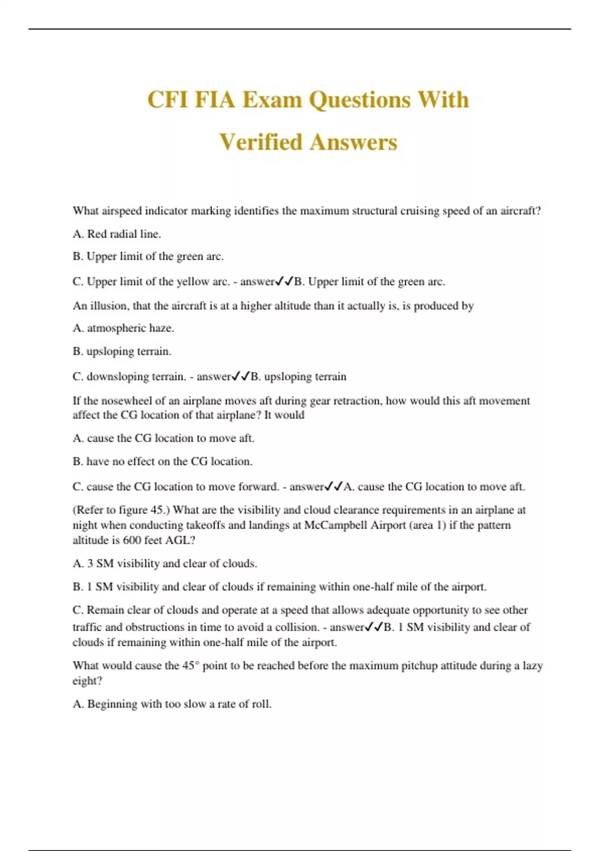 CFI FIA Exam Questions With Verified Answers What airspeed indicator marking identifies the maximum structural cruising speed of an aircraft? A. Red radial line. B. Upper limit of the green arc. C. Upper limit of the yellow arc. - answerB. Upper limit of the green arc. An illusion, that the aircraft is at a higher altitude than it actually is, is produced by A. atmospheric haze. B. upsloping terrain. C. downsloping terrain. - answerB. upsloping terrain If the nosewheel of an airplane moves aft during gear retraction, how would this aft movement affect the CG location of that airplane? It would A. cause the CG location to move aft. B. have no effect on the CG location. C. cause the CG location to move forward. - answerA. cause the CG location to move aft. (Refer to figure 45.) What are the visibility and cloud clearance requirements in an airplane at night when conducting takeoffs and landings at McCampbell Airport (area 1) if the pattern altitude is 600 feet AGL? A. 3 SM visibility and clear of clouds. B. 1 SM visibility and clear of clouds if remaining within one-half mile of the airport. C. Remain clear of clouds and operate at a speed that allows adequate opportunity to see other traffic and obstructions in time to avoid a collision. - answerB. 1 SM visibility and clear of clouds if remaining within one-half mile of the airport. What would cause the 45° point to be reached before the maximum pitchup attitude during a lazy eight? A. Beginning with too slow a rate of roll. B. Beginning with too rapid a rate of roll. C. Allowing the airspeed to remain too high causing the rate of turn to increase. - answerB. Beginning with too rapid a rate of roll. If severe turbulence is encountered, the aircraft's airspeed should be reduced to A. maneuvering speed. B. normal structural cruising speed. C. the minimum steady flight speed in the landing configuration. - answerA. maneuvering speed. If the engine oil temperature and cylinder head temperature gauges have exceeded their normal operating range, you may have been A. operating with the mixture set too rich. B. using fuel that has a higher-than-specified fuel rating. C. operating with too much power and with the mixture set too lean. - answerC. operating with too much power and with the mixture set too lean. When using a Constant Pressure Analysis Chart for planning a flight at 10,000 feet MSL, a pilot should refer to the A. 850-millibar analysis. B. 700-millibar analysis. C. 500-millibar analysis. - answerB. 700-millibar analysis. Which training time must be certified by the instructor from whom it was received? A. Flight training. B. Flight training and training in a flight training device. C. All flight training, flight simulator training, and ground training. - answerC. All flight training, flight simulator training, and ground training. (Refer to figure 45, area 5.) What is the elevation of the Thomas (T69) Airport? A. 122.8 feet MSL. B. 43 feet MSL. C. 48 feet MSL. - answerC. 48 feet MSL. (Refer to figure 14.) At what altitude is the freezing level over the middle of Florida on the 12- hour Significant Weather Prognostic Chart? A. 4,000 feet. B. 12,000 feet. C. 8,000 feet. - answerB. 12,000 feet. 12. What could be a result of a student focusing too far ahead during a landing approach? A. Reactions will be either too abrupt or too late. B. Rounding out too high and developing an excessive sink rate. C. Difficulty in judging the closeness of the ground resulting in a nose-first touchdown. - answerC. Difficulty in judging the closeness of the ground resulting in a nose-first touchdown. 13. What is the duration of a Student Pilot Certificate? A. Indefinite. B. 60 calendar months after the month in which it was issued. C. 24 calendar months after the month in which it was issued. - answerA. Indefinite. 14. Your student, who is preparing for a Private Pilot practical test in a single-engine airplane, received 3.5 hours of cross-country flight training including flights of 1.9 hours, 1.0 hours, and 0.6 hours. Is your student eligible to take the practical test? A. Yes. B. No. C. Yes but, if test is satisfactory, certificate will have an ICAO limitation on it. - answerA. Yes. 15. (Refer to figure 20.) At an airspeed represented by point B, in steady flight, the pilot can expect to obtain the aircraft's A. maximum coefficient of lift. B. minimum coefficient of lift. C. maximum glide range in still air. - answerC. maximum glide range in still air. 16. Leaving the carburetor heat on while taking off A. leans the mixture for more power on takeoff. B. will decrease the takeoff distance. C. will increase the ground roll. - answerC. will increase the ground roll. 17. The basic purpose of adjusting the fuel/air mixture control at altitude is to