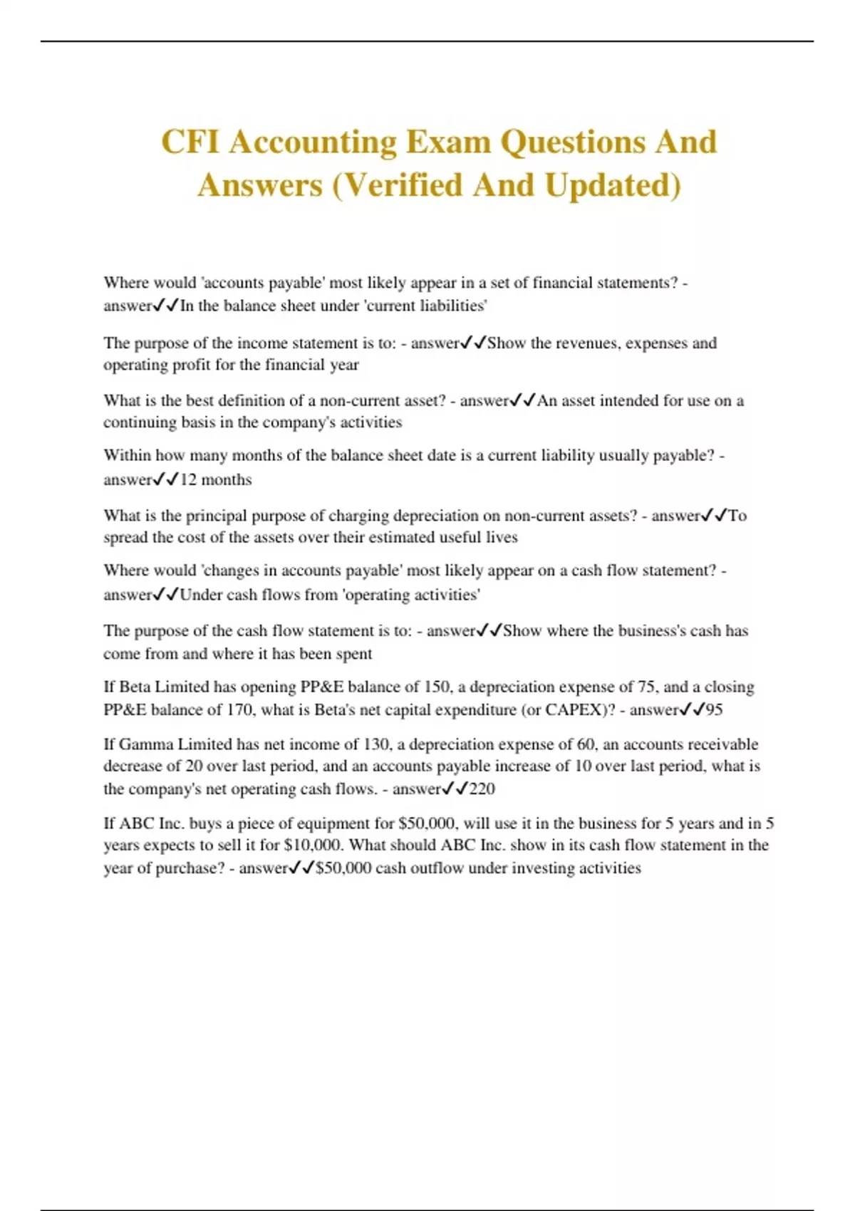 CFI Accounting Exam Questions And Answers (Verified And Updated) Where would 'accounts payable' most likely appear in a set of financial statements? - answerIn the balance sheet under 'current liabilities' The purpose of the income statement is to: - answerShow the revenues, expenses and operating profit for the financial year What is the best definition of a non-current asset? - answerAn asset intended for use on a continuing basis in the company's activities Within how many months of the balance sheet date is a current liability usually payable? - answer12 months What is the principal purpose of charging depreciation on non-current assets? - answerTo spread the cost of the assets over their estimated useful lives Where would 'changes in accounts payable' most likely appear on a cash flow statement? - answerUnder cash flows from 'operating activities' The purpose of the cash flow statement is to: - answerShow where the business's cash has come from and where it has been spent If Beta Limited has opening PP&E balance of 150, a depreciation expense of 75, and a closing PP&E balance of 170, what is Beta's net capital e