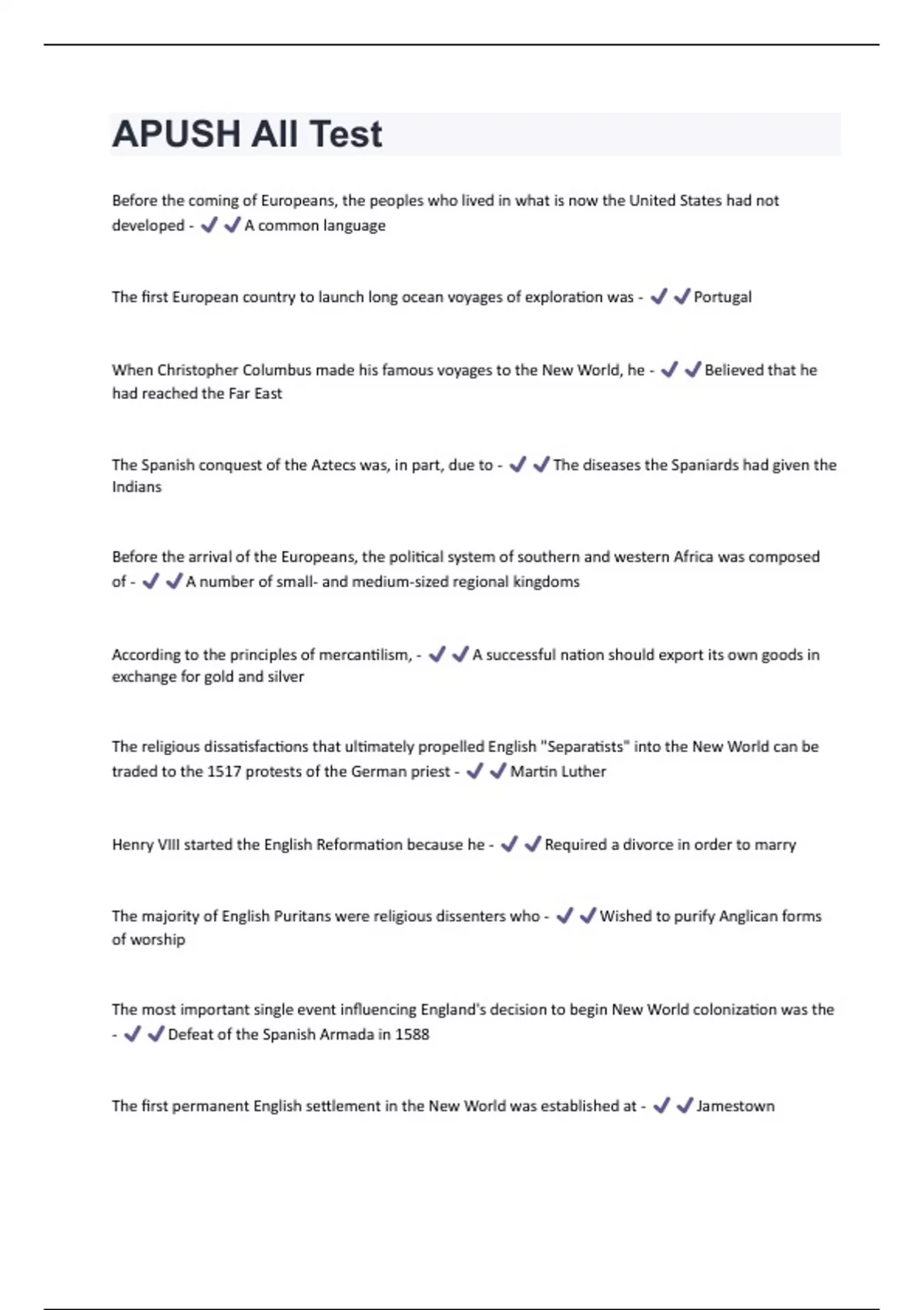 Before the coming of Europeans, the peoples who lived in what is now the United States had not developed - A common language The first European country to launch long ocean voyages of exploration was - Portugal When Christopher Columbus made his famous voyages to the New World, he - Believed that he had reached the Far East The Spanish conquest of the Aztecs was, in part, due to - The diseases the Spaniards had given the Indians Before the arrival of the Europeans, the political system of southern and western Africa was composed of - A number of small- and medium-sized regional kingdoms According to the principles of mercantilism, - A successful nation should export its own goods in exchange for gold and silver The religious dissatisfactions that ultimately propelled English "Separatists" into the New World can be traded to the 1517 protests of the German priest - Martin Luther Henry VIII started the English Reformation because he - Required a divorce in order to marry The majority of English Puritans were religious dissenters who - Wished to purify Anglican forms of worship The most important single event influencing England's decision to begin New World colonization was the - Defeat of the Spanish Armada in 1588 The first permanent English settlement in the New World was established at - JamestownCivilizations in the Americas before the arrival of Columbus - Included elaborate and sophisticated cultures that rivaled those of Europe The Treaty of Tordesillas contained a provision to - Divide the Americas between Spain and Portugal to colonize The Coureurs des Bois relationship with Indians differed from the English because - They formed successful partnerships with Indians by becoming a part of native society and intermarrying An assumption that the English learned in Ireland and brought to their American settlements was - English colonial settlements must remain separated from native populations