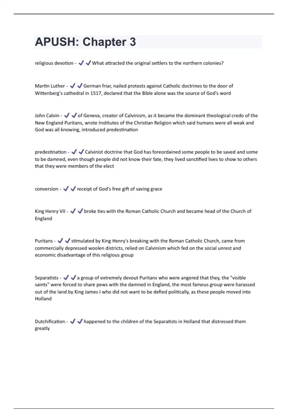 religious devotion - What attracted the original settlers to the northern colonies? Martin Luther - German friar, nailed protests against Catholic doctrines to the door of Wittenberg's cathedral in 1517, declared that the Bible alone was the source of God's word John Calvin - of Geneva, creator of Calvinism, as it became the dominant theological credo of the New England Puritans, wrote Institutes of the Christian Religion which said humans were all weak and God was all knowing, introduced predestination predestination - Calvinist doctrine that God has foreordained some people to be saved and some to be damned, even though people did not know their fate, they lived sanctified lives to show to others that they were members of the elect conversion - receipt of God's free gift of saving grace King Henry VII - broke ties with the Roman Catholic Church and became head of the Church of England Puritans - stimulated by King Henry's breaking with the Roman Catholic Church, came from commercially depressed woolen districts, relied on Calvinism which fed on the social unrest and economic disadvantage of this religious group Separatists - a group of extremely devout Puritans who were angered that they, the "visible saints" were forced to share pews with the damned in England, the most famous group were harassed out of the land by King James I who did not want to be defied politically, as these people moved into Holland Dutchification - happened to the children of the Separatists in Holland that distressed them greatlyMayflower - the ship that the Separatists sailed to New England on after securing a charter with the Virginia Company after living in Holland Captain Myles Standish - Separatist who sailed on the Mayflower, Indian fighter and negotiator Plymouth Bay - location chosen by the Pilgrims to settle, became squatters here since they had missed the land under their charter Mayflower Compact - written by the pilgrims, a simple agreement to form a crude government and to submit to the will of the majority under the regulations agreed upon 44 - How many survivors of the 102 Pilgrims were left after their first winter? Thanksgiving - in 1621, the year after the Pilgrims arrived in New England, the celebration of bountiful harvests fur, fish, lumber - three things that stimulated the early Pilgrims' economy beaver and Bible - two mainstays of the Pilgrims, one for the body and one for the soul
