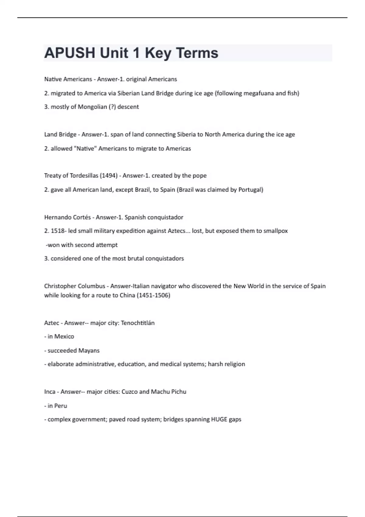 Native Americans - Answer-1. original Americans 2. migrated to America via Siberian Land Bridge during ice age (following megafuana and fish) 3. mostly of Mongolian (?) descent Land Bridge - Answer-1. span of land connecting Siberia to North America during the ice age 2. allowed "Native" Americans to migrate to Americas Treaty of Tordesillas (1494) - Answer-1. created by the pope 2. gave all American land, except Brazil, to Spain (Brazil was claimed by Portugal) Hernando Cortés - Answer-1. Spanish conquistador 2. 1518- led small military expedition against Aztecs... lost, but exposed them to smallpox -won with second attempt 3. considered one of the most brutal conquistadors Christopher Columbus - Answer-Italian navigator who discovered the New World in the service of Spain while looking for a route to China () Aztec - Answer-- major city: Tenochtitlán - in Mexico - succeeded Mayans - elaborate administrative, education, and medical systems; harsh religion Inca - Answer-- major cities: Cuzco and Machu Pichu - in Peru - complex government; paved road system; bridges spanning HUGE gapsMaya - Answer-- major cities: Mayapan - Central America and Yucatan Peninsula - sophisticated culture, written language, numerical system, accurate calendar, advanced agricultural system Conquistadors - Answer-Spanish conquerors (see also: Francisco Pizarro, Hernando Cortes) Fransisco Pizarro - Answer-1. Spanish conqueror 2. conquered Incans in 1538 St. Augustine, Florida - Answer-Spanish fort founded 1565 Encomiendas - Answer-1. legal system employed by Spanish in America 2. granted a specific number of natives to each Spanish citizen Maize - Answer-corn Mestizos - Answer-1. part Spanish, part Native 2. not accepted by either group Mercantilism - Answer-"economics of empire building" - basis for creation of colonies and how mother country treated them - colonies exist to give raw materials to mother country and buy manufactured goods back