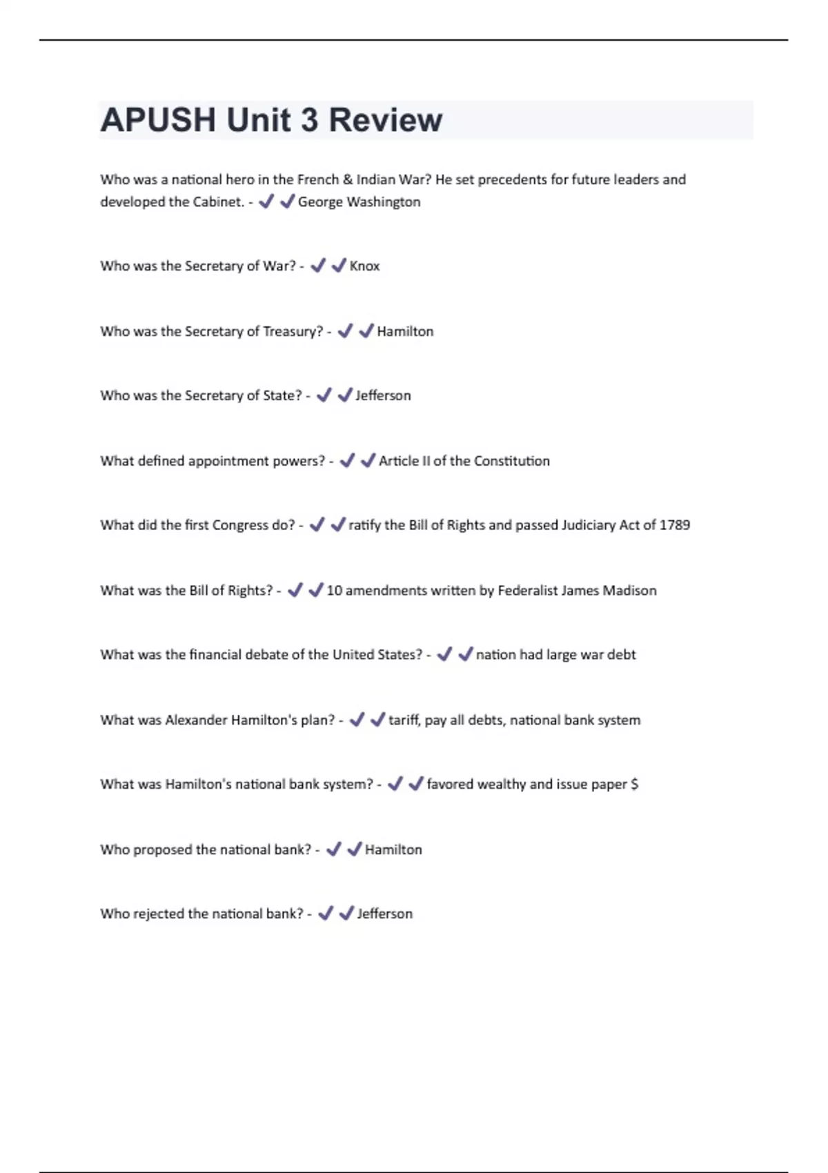 Who was a national hero in the French & Indian War? He set precedents for future leaders and developed the Cabinet. - George Washington Who was the Secretary of War? - Knox Who was the Secretary of Treasury? - Hamilton Who was the Secretary of State? - Jefferson What defined appointment powers? - Article II of the Constitution What did the first Congress do? - ratify the Bill of Rights and passed Judiciary Act of 1789 What was the Bill of Rights? - 10 amendments written by Federalist James Madison What was the financial debate of the United States? - nation had large war debt What was Alexander Hamilton's plan? - tariff, pay all debts, national bank system What was Hamilton's national bank system? - favored wealthy and issue paper $ Who proposed the national bank? - Hamilton Who rejected the national bank? - JeffersonWhat were political affairs during the French Revolution in 1789? - British and French at war, Americans split on who to support, Washington claimed neutral (Neutrality Acts) What was the Whiskey Rebellion? - Farmer's rebellion over an excise tax on whiskey they produced What did the Whiskey Rebellion prove? - the strength of the new federal government Who did Jay's Treaty favor? - Britain