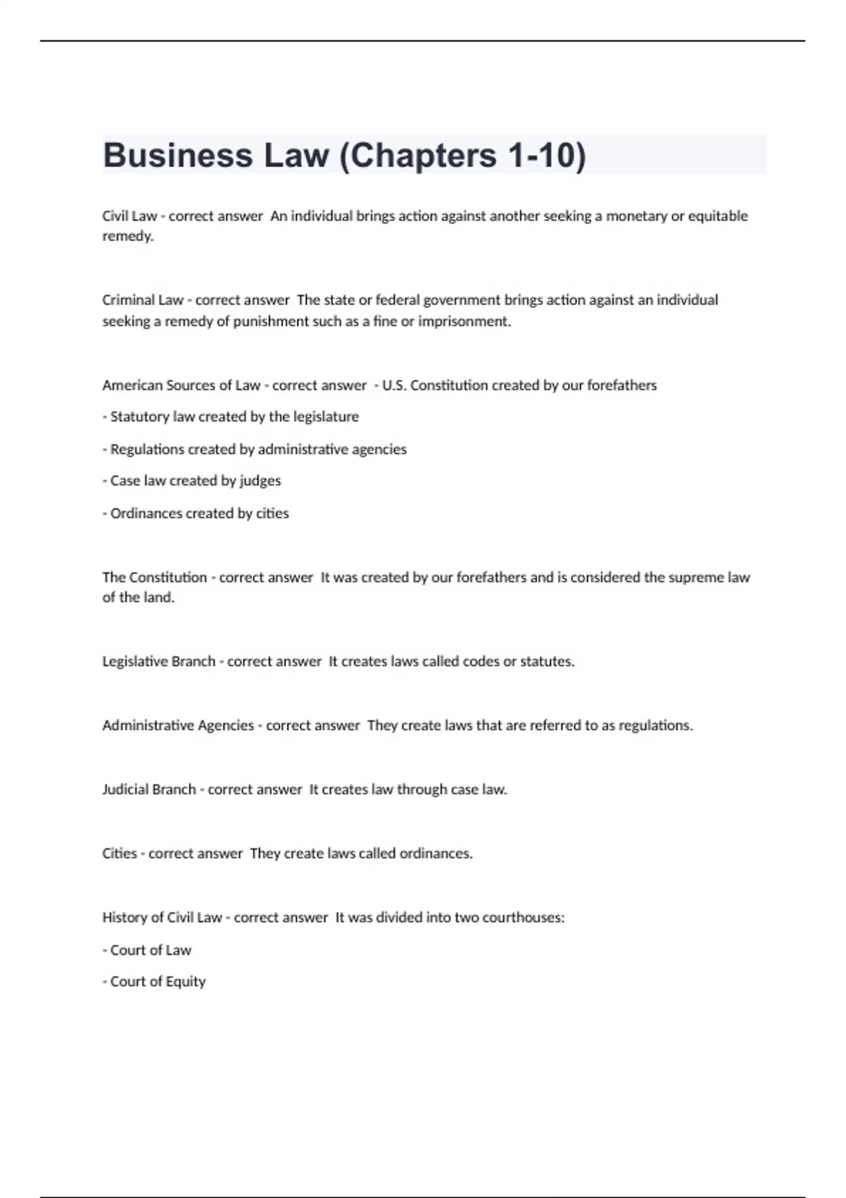 Business Law Collin College -Business Law (Chapters 1-10) questions n answers Civil Law - correct answer An individual brings action against another seeking a monetary or equitable remedy. Criminal Law - correct answer The state or federal government brings action against an individual seeking a remedy of punishment such as a fine or imprisonment. American Sources of Law - correct answer - U.S. Constitution created by our forefathers - Statutory law created by the legislature - Regulations created by administrative agencies - Case law created by judges - Ordinances created by cities The Constitution - correct answer It was created by our forefathers and is considered the supreme law of the land. Legislative Branch - correct answer It creates laws called codes or statutes. Administrative Agencies - correct answer They create laws that are referred to as regulations. Judicial Branch - correct answer It creates law through case law. Cities - correct answer They create laws called ordinances. History of Civil Law - correct answer It was divided into two courthouses: - Court of Law - Court of Equity