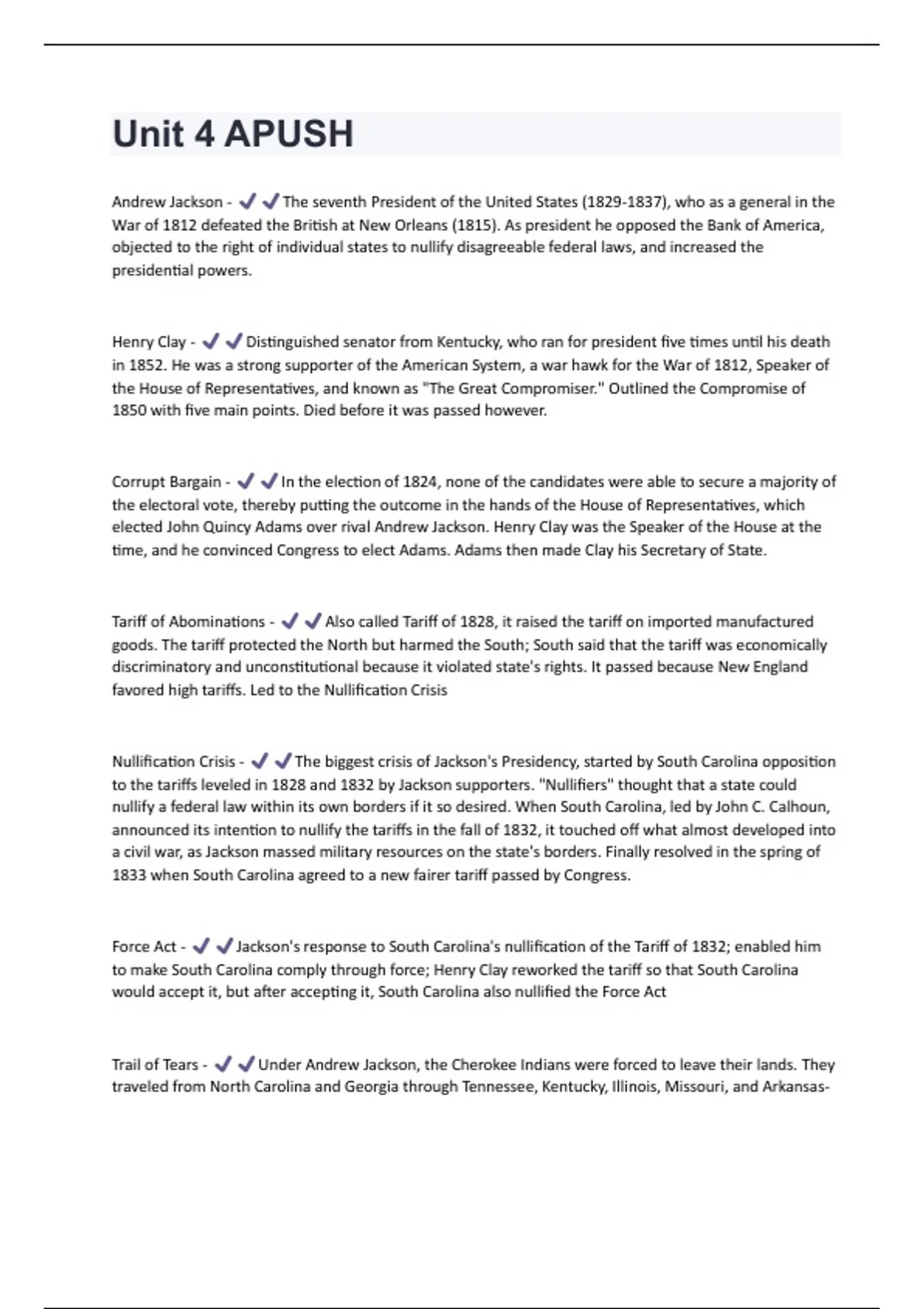 Andrew Jackson - The seventh President of the United States (), who as a general in the War of 1812 defeated the British at New Orleans (1815). As president he opposed the Bank of America, objected to the right of individual states to nullify disagreeable federal laws, and increased the presidential powers. Henry Clay - Distinguished senator from Kentucky, who ran for president five times until his death in 1852. He was a strong supporter of the American System, a war hawk for the War of 1812, Speaker of the House of Representatives, and known as "The Great Compromiser." Outlined the Compromise of 1850 with five main points. Died before it was passed however. Corrupt Bargain - In the election of 1824, none of the candidates were able to secure a majority of the electoral vote, thereby putting the outcome in the hands of the House of Representatives, which elected John Quincy Adams over rival Andrew Jackson. Henry Clay was the Speaker of the House at the time, and he convinced Congress to elect Adams. Adams then made Clay his Secretary of State. Tariff of Abominations - Also called Tariff of 1828, it raised the tariff on imported manufactured goods. The tariff protected the North but harmed the South; South said that the tariff was economically discriminatory and unconstitutional because it violated state's rights. It passed because New England favored high tariffs. Led to the Nullification Crisis Nullification Crisis - The biggest crisis of Jackson's Presidency, started by South Carolina opposition to the tariffs leveled in 1828 and 1832 by Jackson supporters. "Nullifiers" thought that a state could nullify a federal law within its own borders if it so desired. When South Carolina, led by John C. Calhoun, announced its intention to nullify the tariffs in the fall of 1832, it touched off what almost developed into a civil war, as Jackson massed military resources on the state's borders. Finally resolved in the spring of 1833 when South Carolina agreed to a new fairer tariff passed by Congress. Force Act - Jackson's response to South Carolina's nullification of the Tariff of 1832; enabled him to make South Carolina comply through force; Henry Clay reworked the tariff so that South Carolina would accept it, but after accepting it, South Carolina also nullified the Force Act