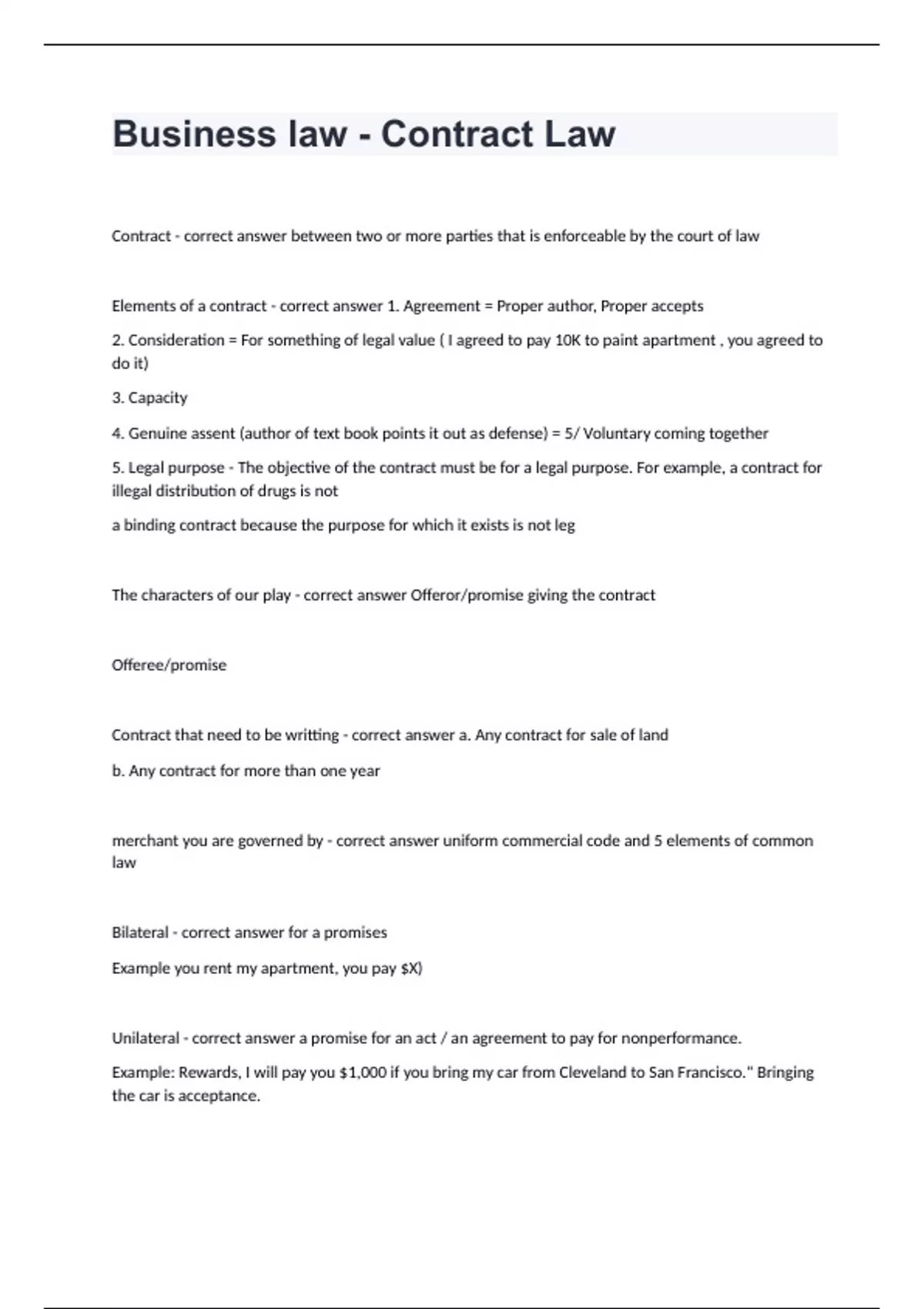 Business Law Collin College -Business law - Contract Law fully solved graded Contract - correct answer between two or more parties that is enforceable by the court of law Elements of a contract - correct answer 1. Agreement = Proper author, Proper accepts 2. Consideration = For something of legal value ( I agreed to pay 10K to paint apartment , you agreed to do it) 3. Capacity 4. Genuine assent (author of text book points it out as defense) = 5/ Voluntary coming together 5. Legal purpose - The objective of the contract must be for a legal purpose. For example, a contract for illegal distribution of drugs is not a binding contract because the purpose for which it exists is not leg The characters of our play - correct answer Offeror/promise giving the contract Offeree/promise Contract that need to be writting - correct answer a. Any contract for sale of land b. Any contract for more than one year merchant you are governed by - correct answer uniform commercial code and 5 elements of common law Bilateral - correct answer for a promises Example you rent my apartment, you pay $X) Unilateral - correct answer a promise for an act / an agreement to pay for nonperformance. Example: Rewards, I will pay you $1,000 if you bring my car from Cleveland to San Francisco." Bringing the car is acceptance.