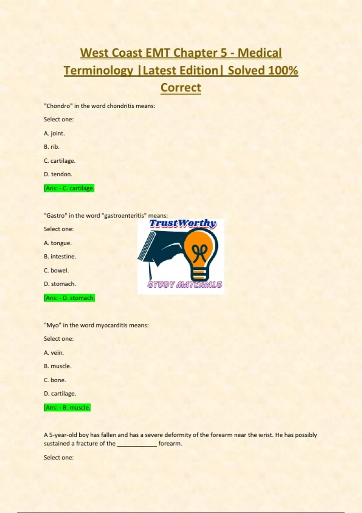 West Coast EMT Chapter 5 - Medical Terminology |Latest Edition| Solved 100% Correct,West Coast EMT Chapter 5 - Medical Terminology |Latest Edition| Solved 100% Correct