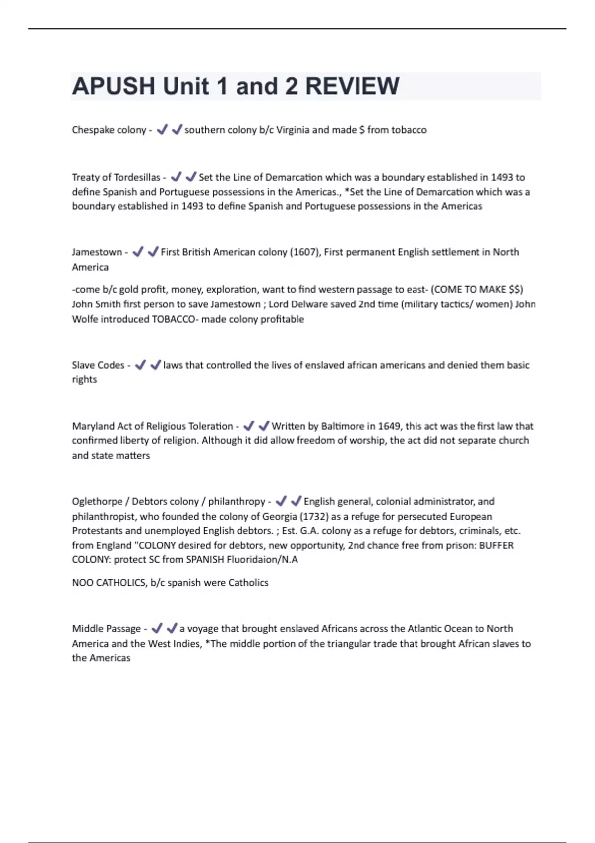 Chespake colony - southern colony b/c Virginia and made $ from tobacco Treaty of Tordesillas - Set the Line of Demarcation which was a boundary established in 1493 to define Spanish and Portuguese possessions in the Americas., *Set the Line of Demarcation which was a boundary established in 1493 to define Spanish and Portuguese possessions in the Americas Jamestown - First British American colony (1607), First permanent English settlement in North America -come b/c gold profit, money, exploration, want to find western passage to east- (COME TO MAKE $$) John Smith first person to save Jamestown ; Lord Delware saved 2nd time (military tactics/ women) John Wolfe introduced TOBACCO- made colony profitable Slave Codes - laws that controlled the lives of enslaved african americans and denied them basic rights Maryland Act of Religious Toleration - Written by Baltimore in 1649, this act was the first law that confirmed liberty of religion. Although it did allow freedom of worship, the act did not separate church and state matters Oglethorpe / Debtors colony / philanthropy - English general, colonial administrator, and philanthropist, who founded the colony of Georgia (1732) as a refuge for persecuted European Protestants and unemployed English debtors. ; Est. G.A. colony as a refuge for debtors, criminals, etc. from England "COLONY desired for debtors, new opportunity, 2nd chance free from prison: BUFFER COLONY: protect SC from SPANISH Fluoridaion/N.A NOO CATHOLICS, b/c spanish were Catholics Middle Passage - a voyage that brought enslaved Africans across the Atlantic Ocean to North America and the West Indies, *The middle portion of the triangular trade that brought African slaves to the AmericasIndentured servants - poor colonists who received free passage to North America in exchange for working without pay for a certain number of years ;immigrants (Head-right system) rich gave poor opportunity to come to america LARGEST GRP IN CHESAPEAKE COLONY House of Burgesses - the first elected legislative assembly in the New World established in the Colony of Virginia in 1619, representative colony set up by England to make laws and levy taxes but England could veto its legislative acts.-"1st institution of democracy" Puritans - A religious group who wanted to purify the Church of England. They came to America for religious freedom and settled Massachusetts Bay. Great Migration - When more than 15,000 Puritans journeyed to Massachusetts to escape religious persecution and economic hard times